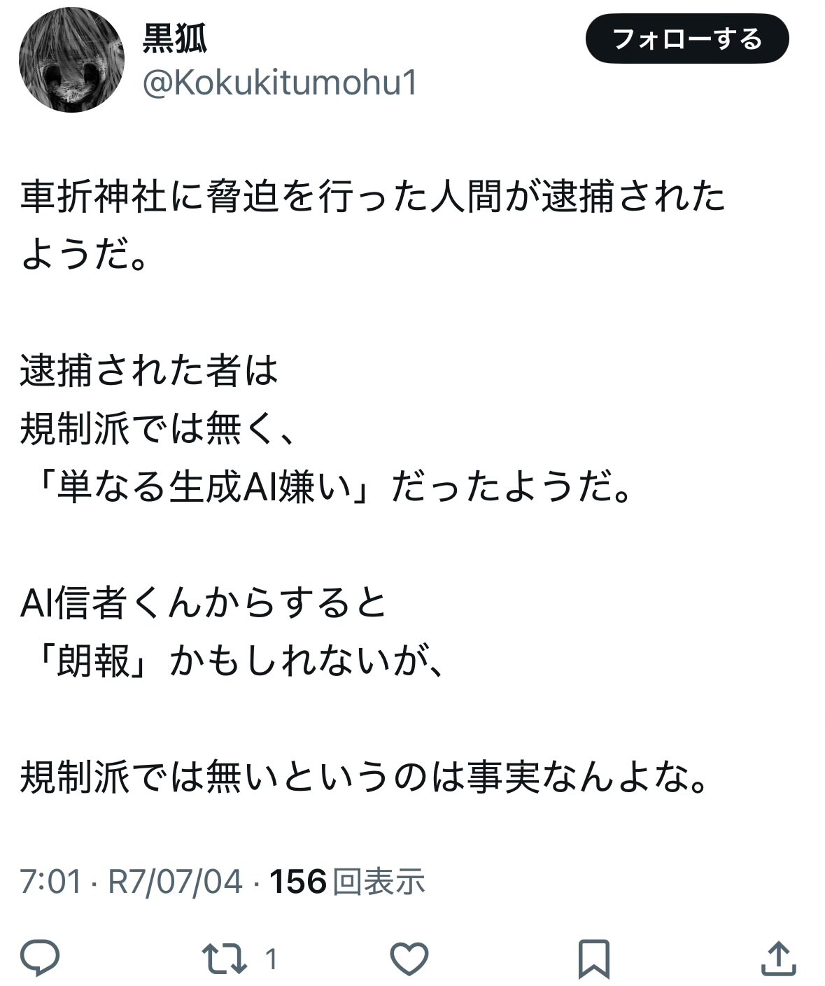 そもそもネット上のAI論争なんてなんの影響力も無いただの小競り合いだったのに陣営問わず犯罪やらかすようなやつが出てきてるのはリアルが無いムシケラどもの悲哀を感じますね