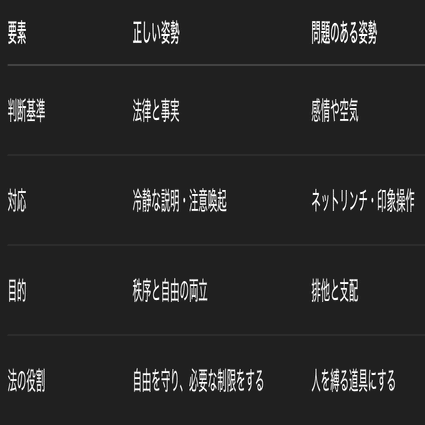 この原則を無視して、「自分の思い」や「空気」「道徳感情」で他人の行動を制限しようとするのは、法治ではなく感情支配・空気支配に近づいてしまいます。
