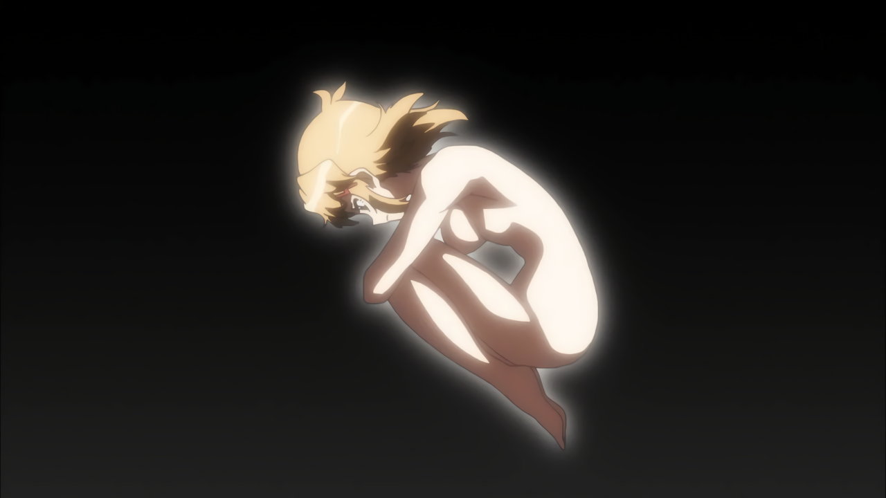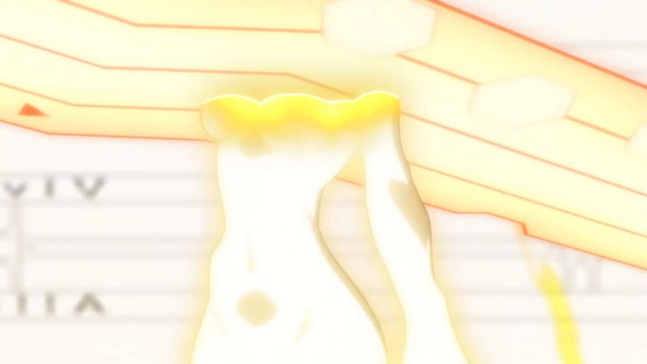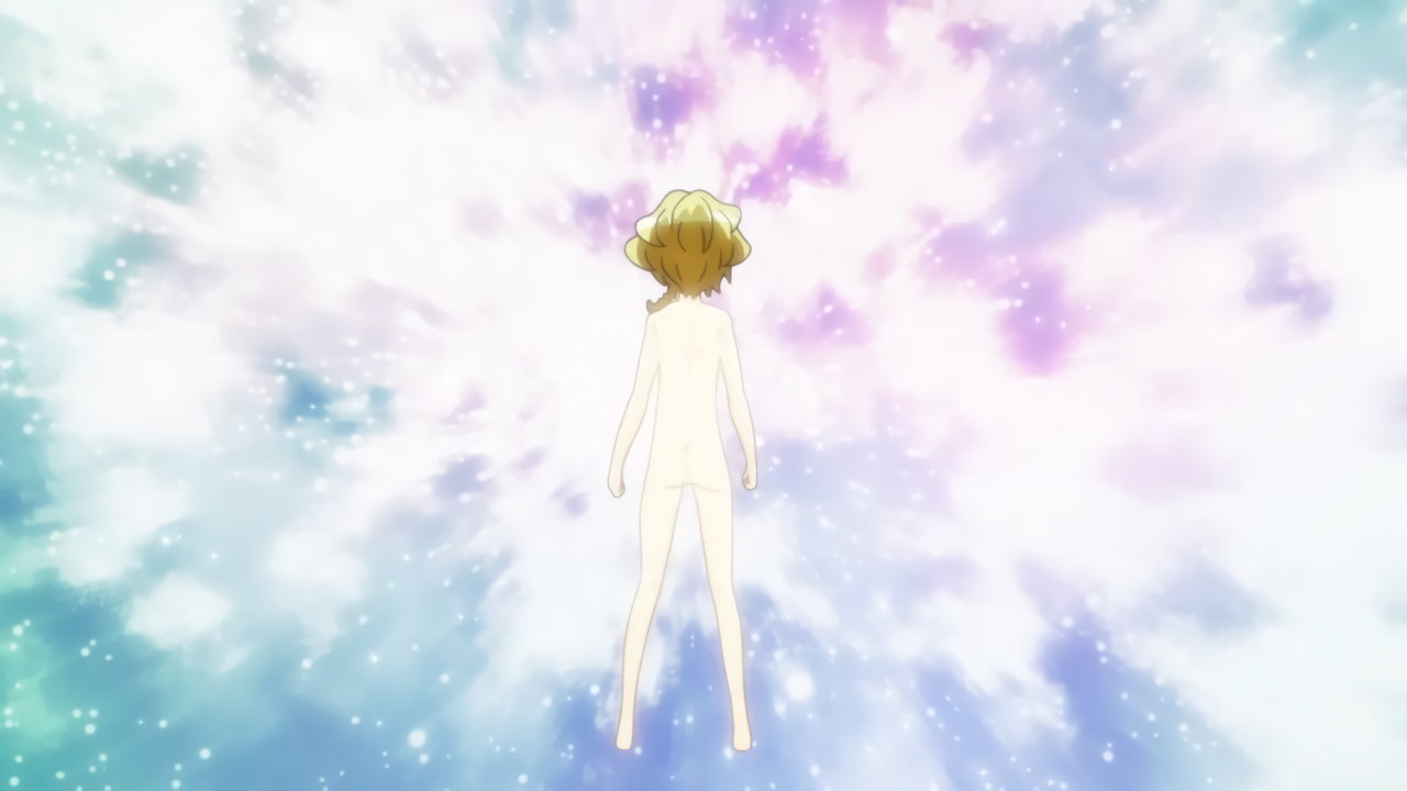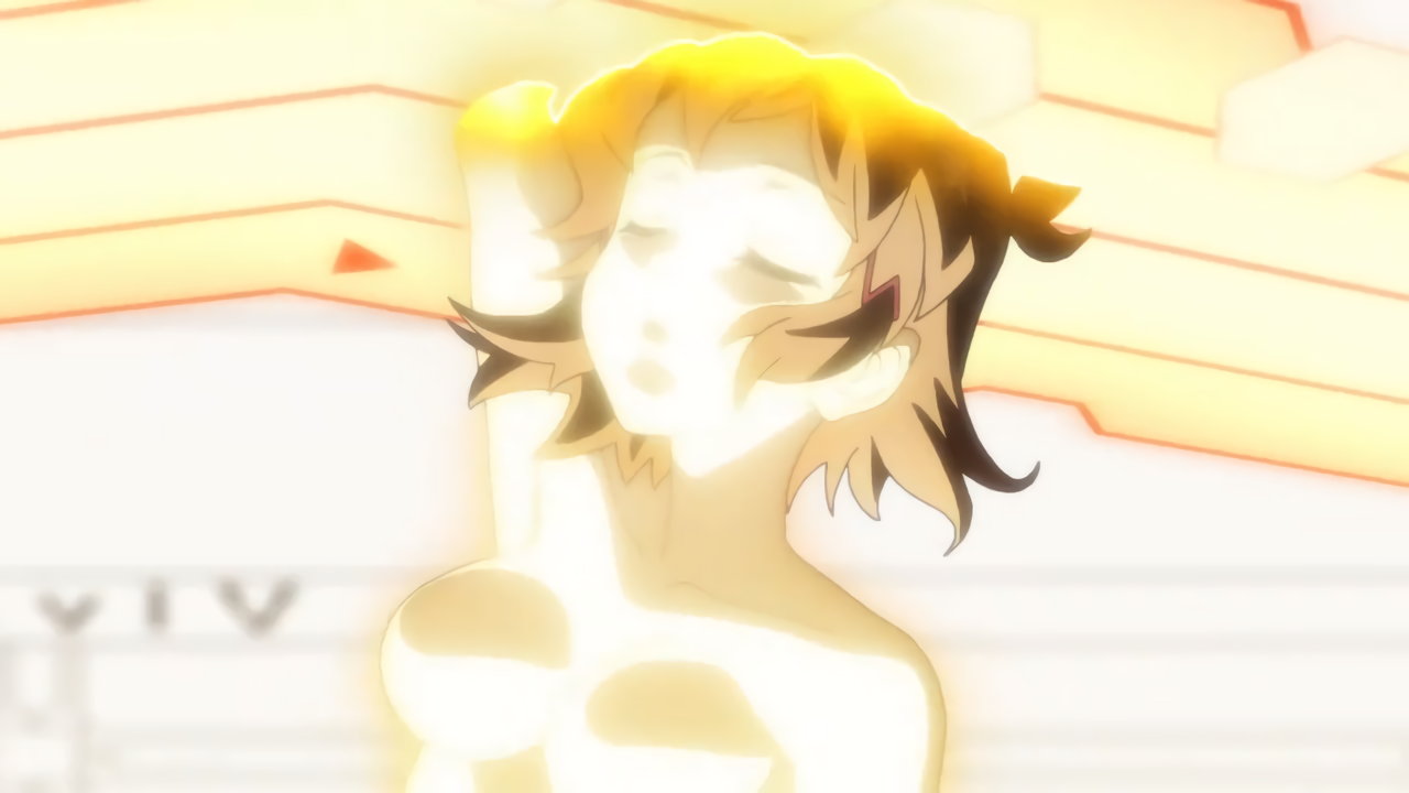 変身バンクシーンにて、発光全裸回転する響。