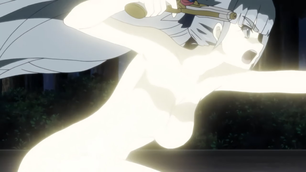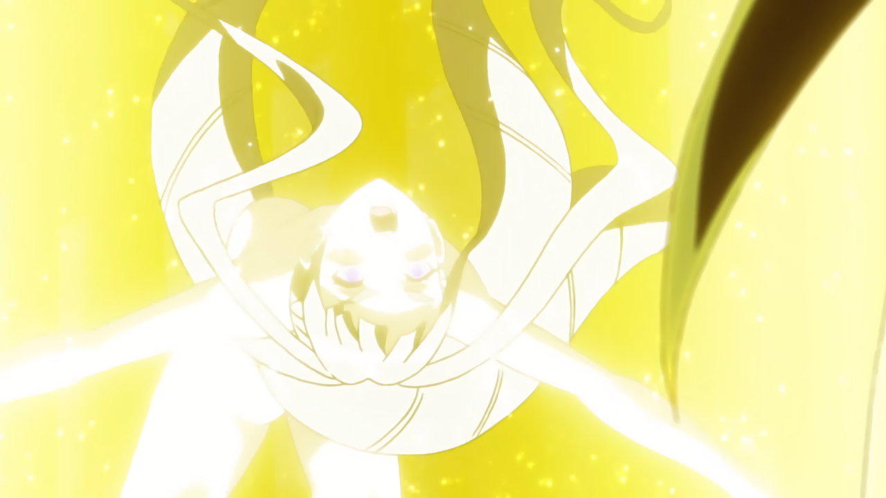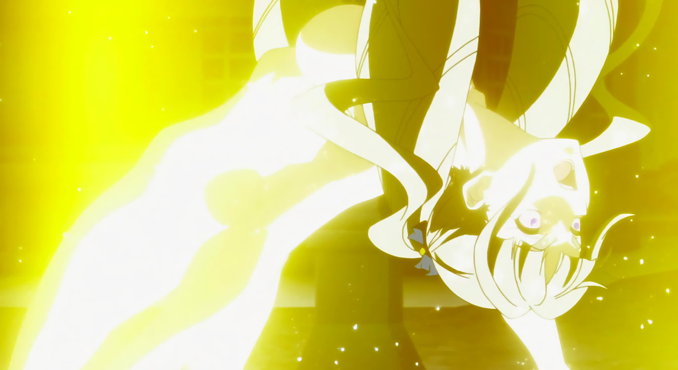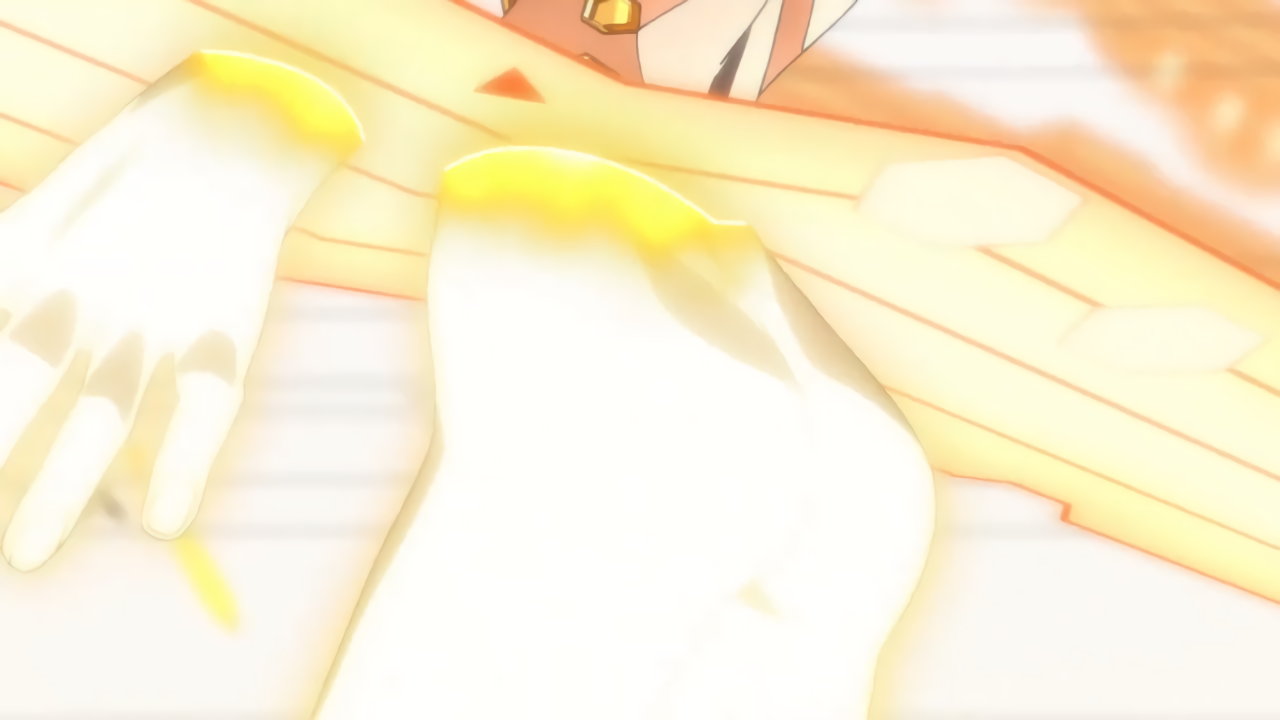 変身バンクシーンにて、発光全裸回転する響。