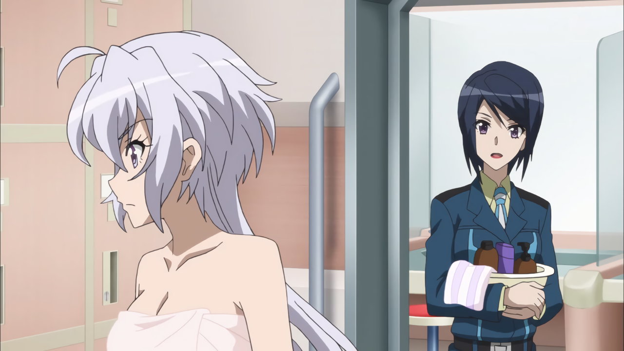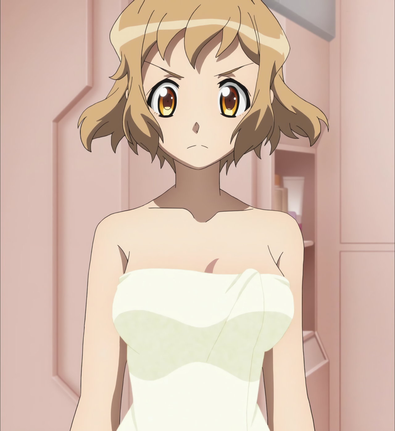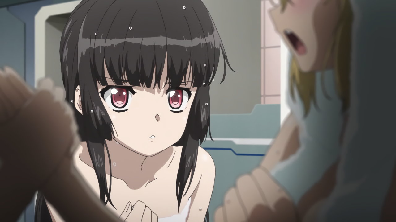全裸の切歌と響を凝視する、裸バスタオル姿の調。