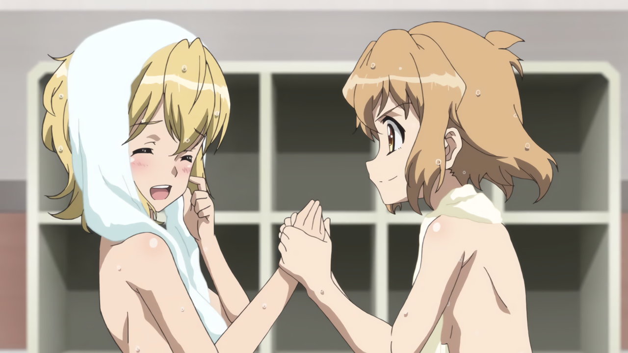 シャワー上がりの切歌に、熱い全裸激励をする響。