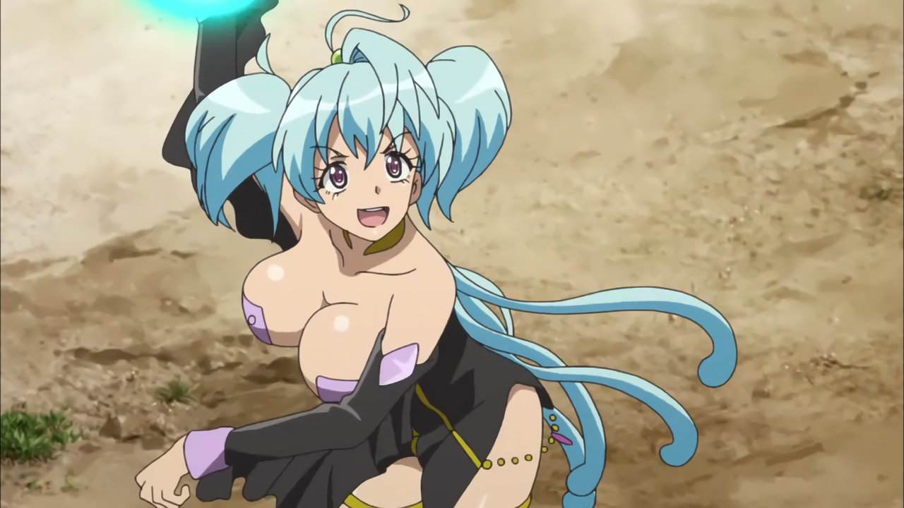 胸元全開の服を着て、巨乳を揺らしながら戦うカリオストロ。