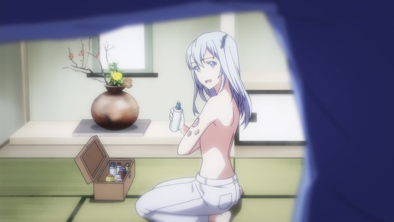 上半身裸となり、皮膚の修復作業中のレイシア。