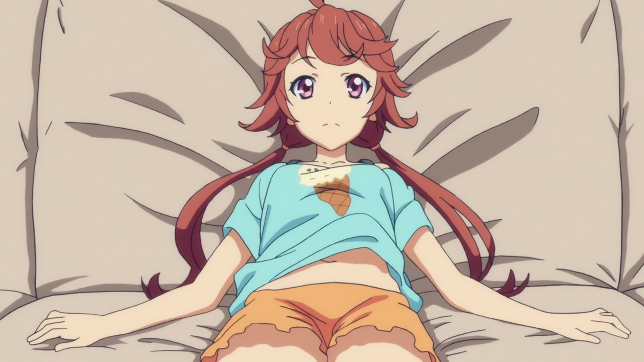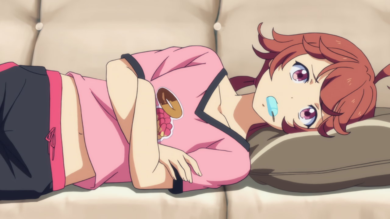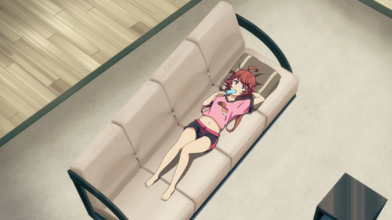 臍と生脚を見せつつソファーに寝そべる、薄着のユカ。
