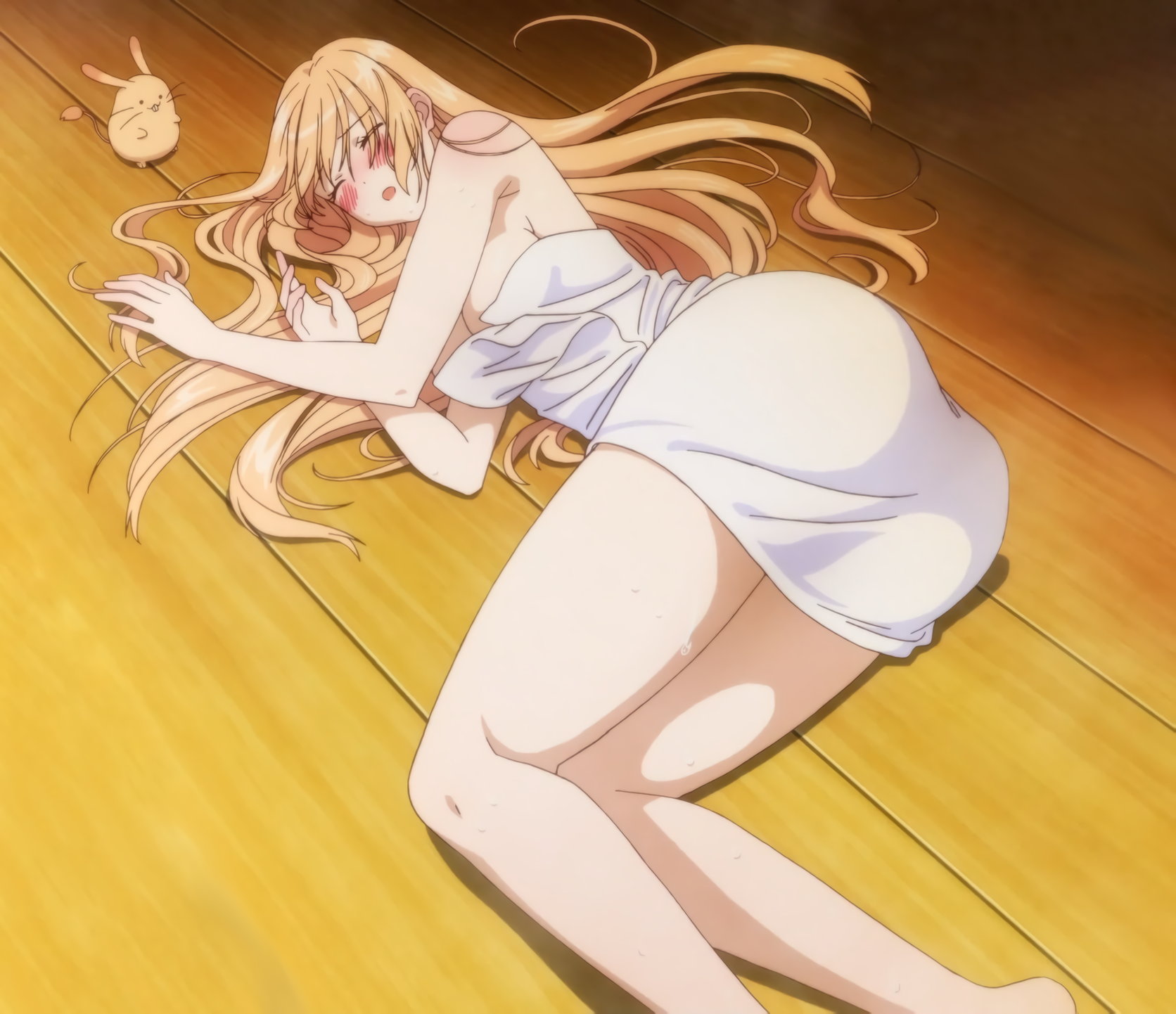 脱衣所の床に倒れ、赤面しながら喘ぐ、裸バスタオル姿のリリエッタ。