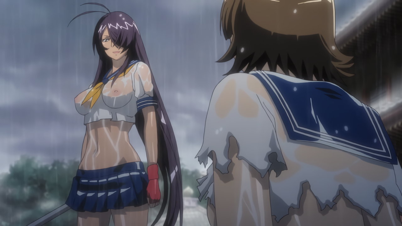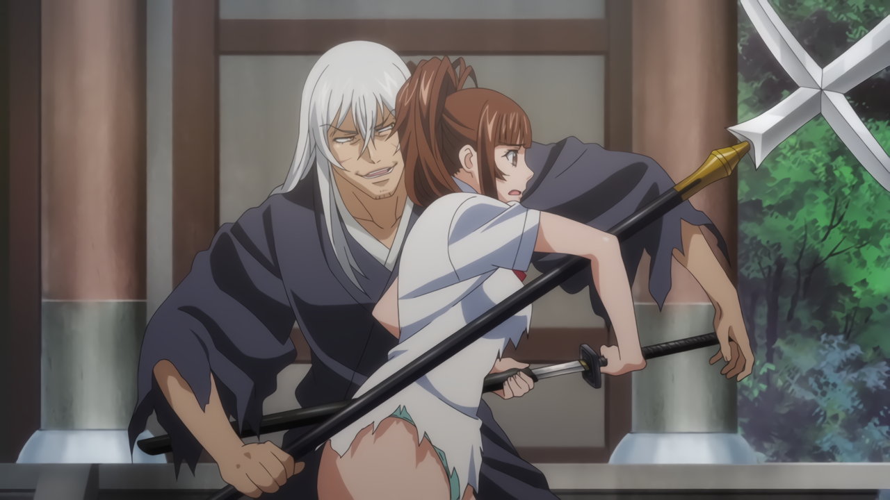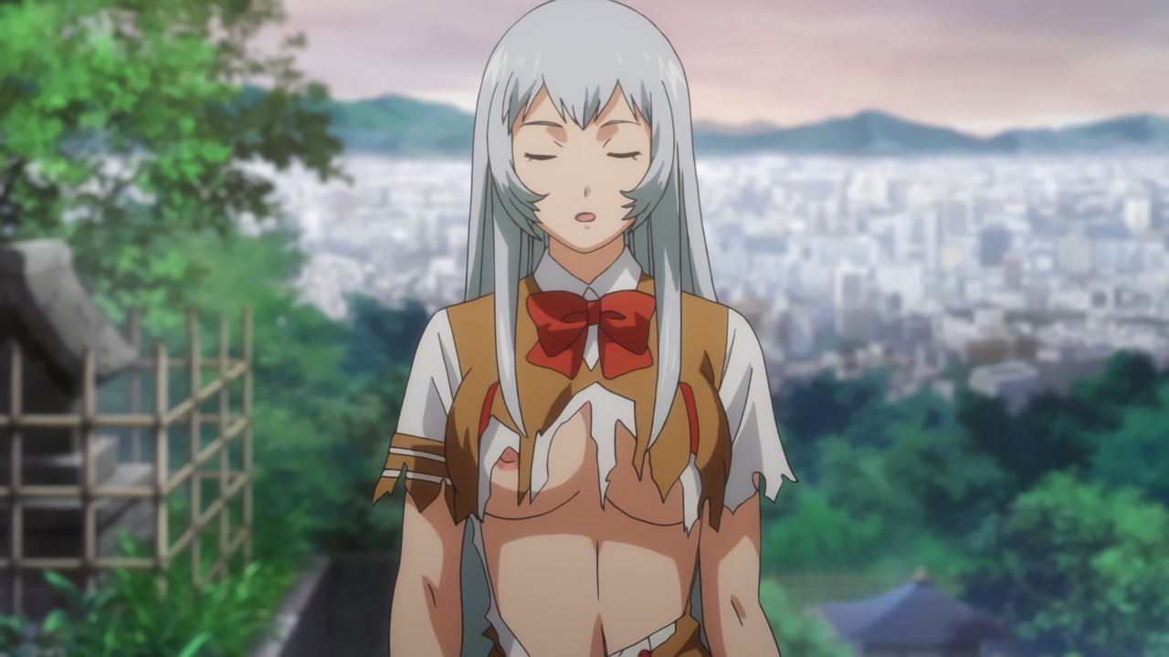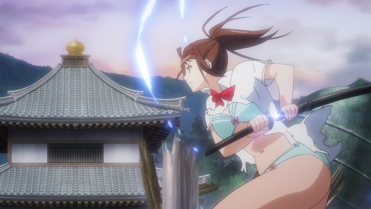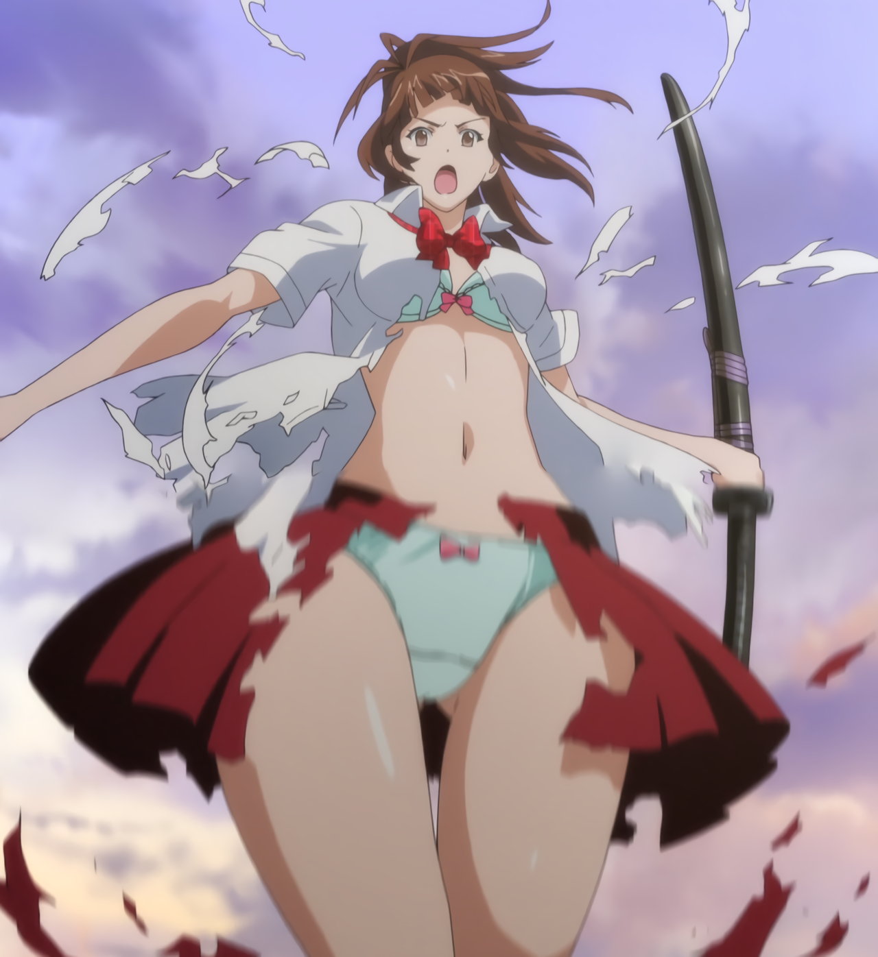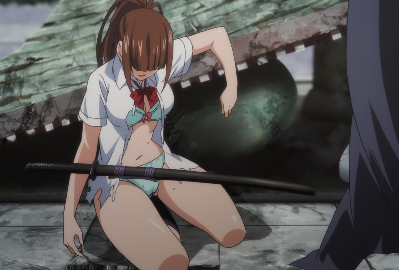 胤舜と戦う、制服中破・半裸状態の関羽。