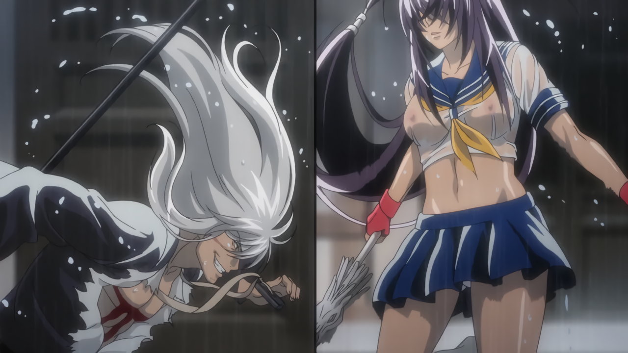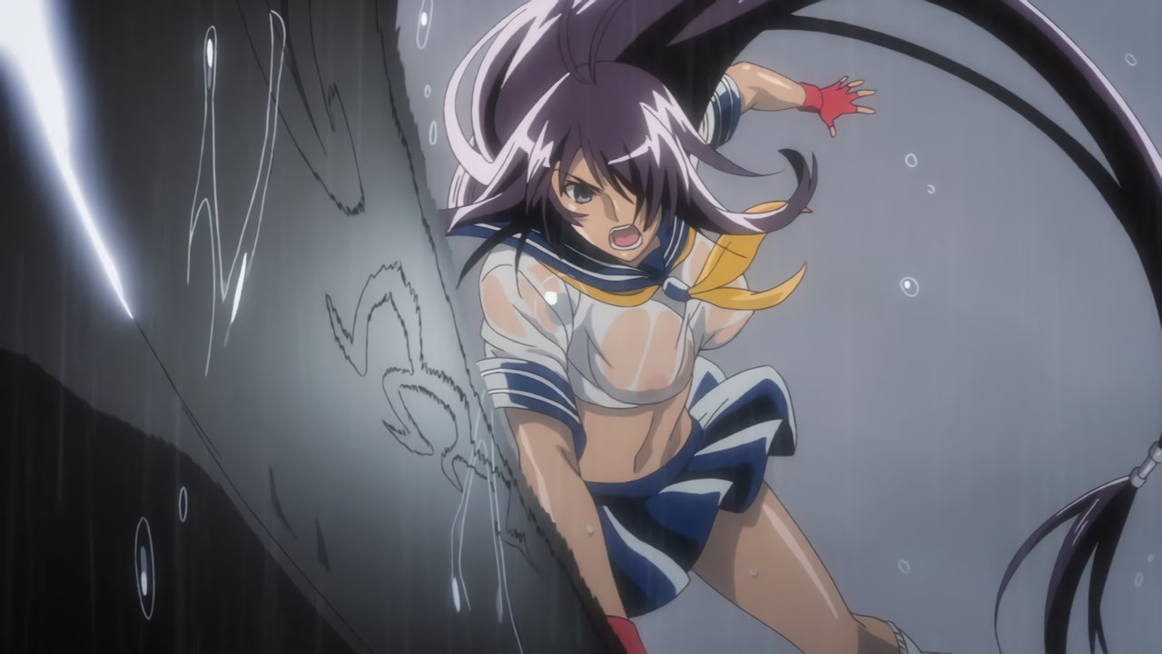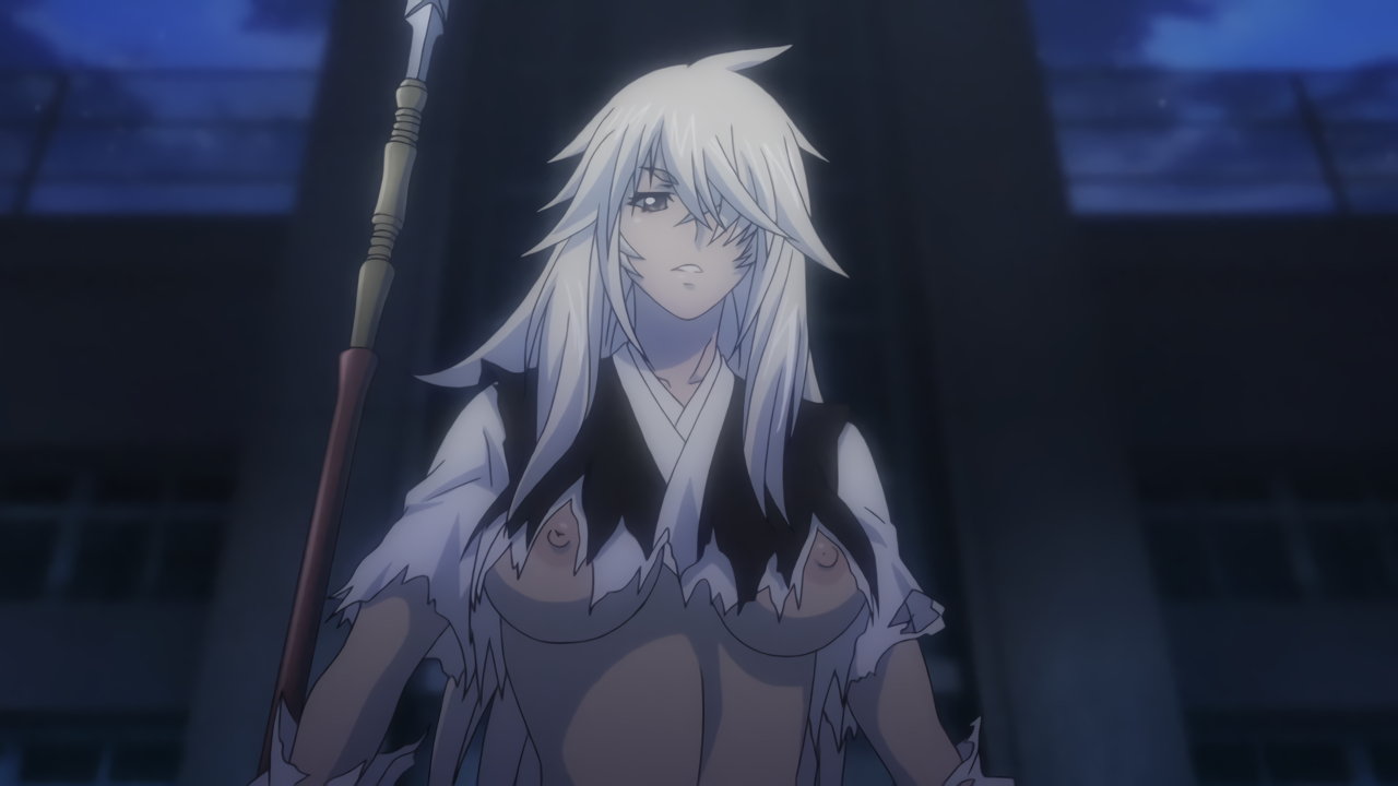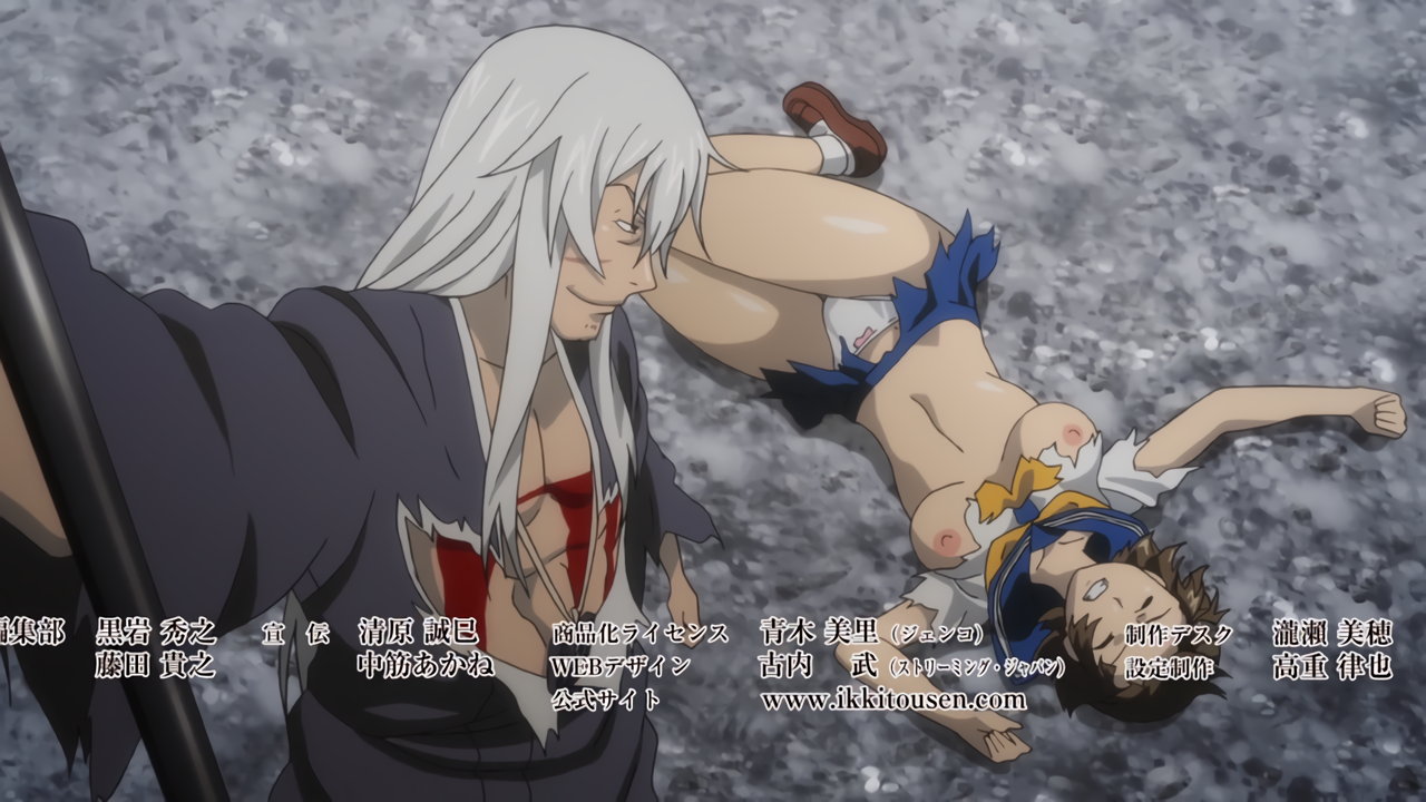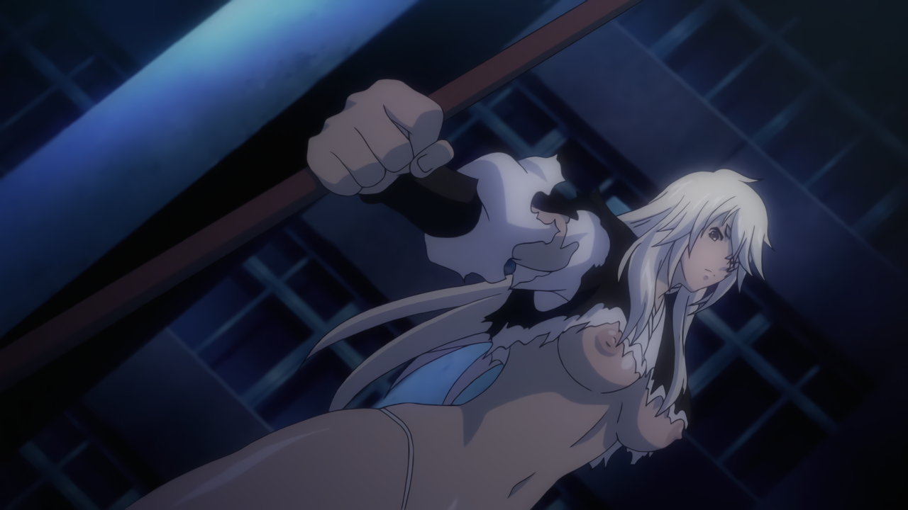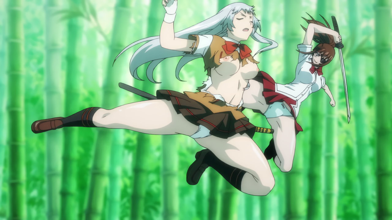 胤舜と戦う、制服中破・半裸状態の関羽。