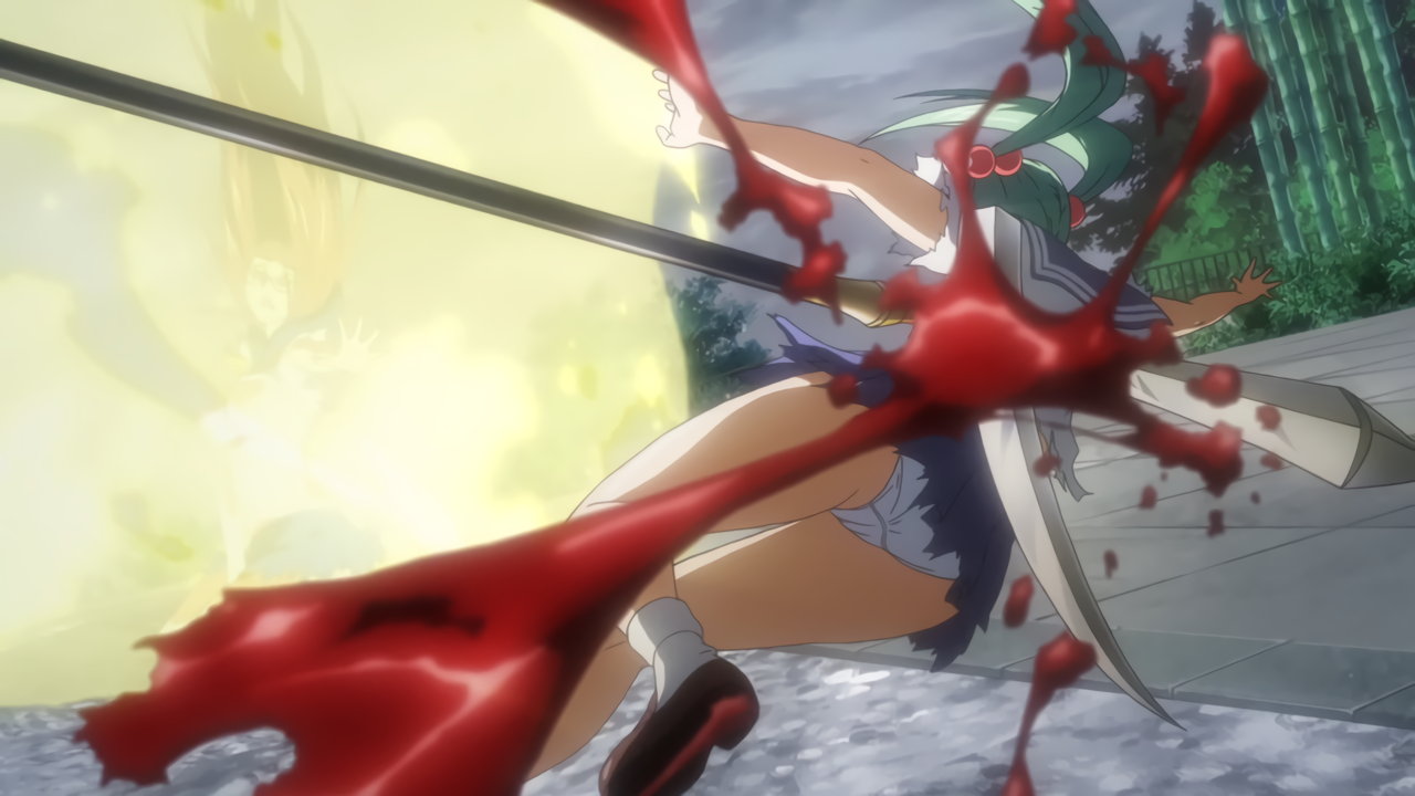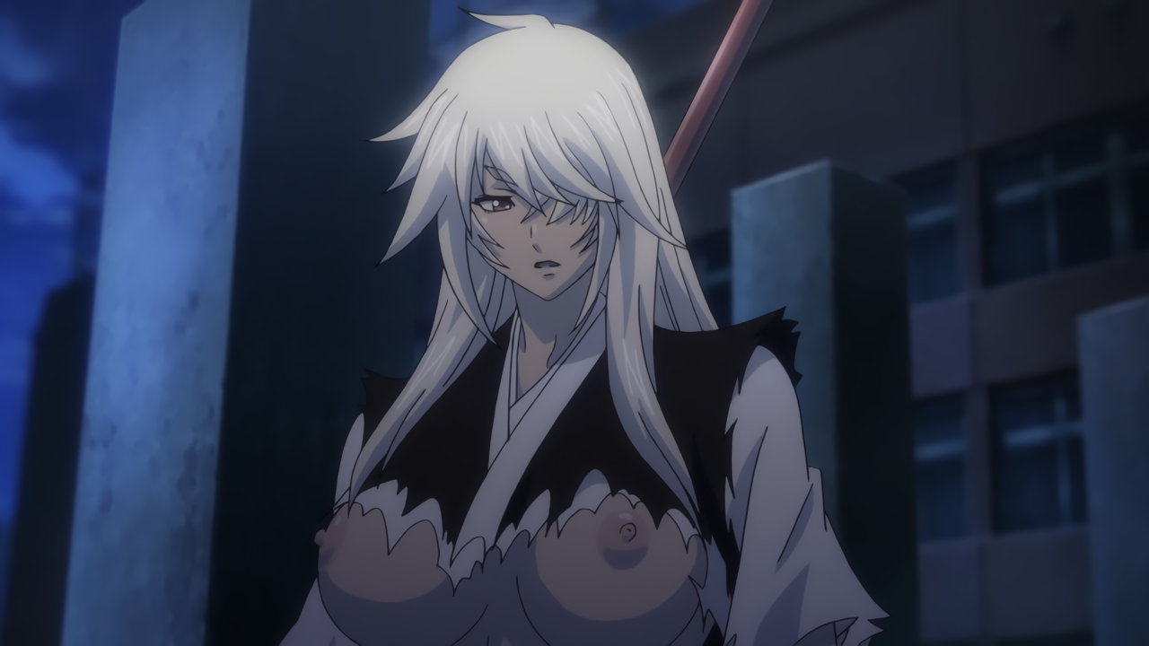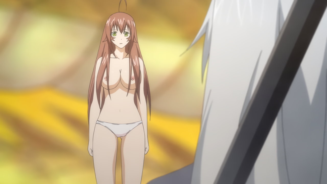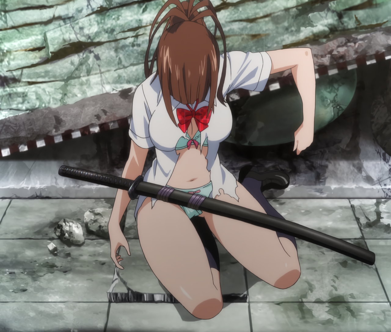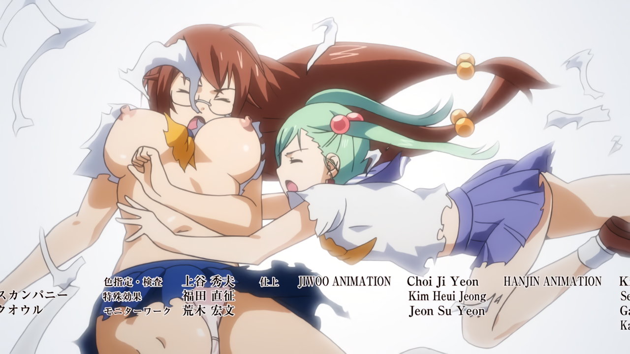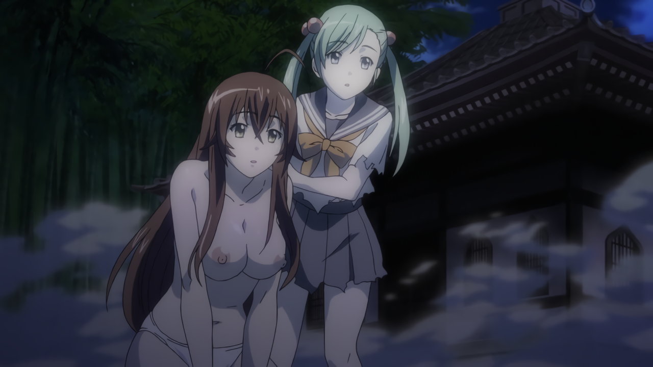 胤舜と戦う、制服中破・半裸状態の関羽。