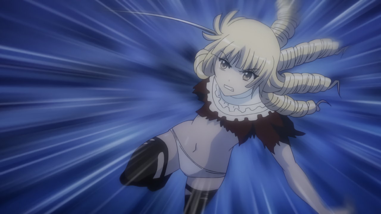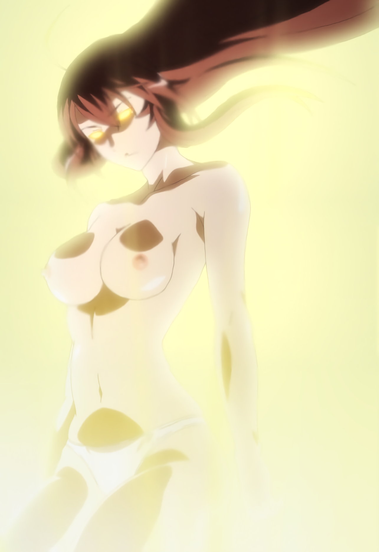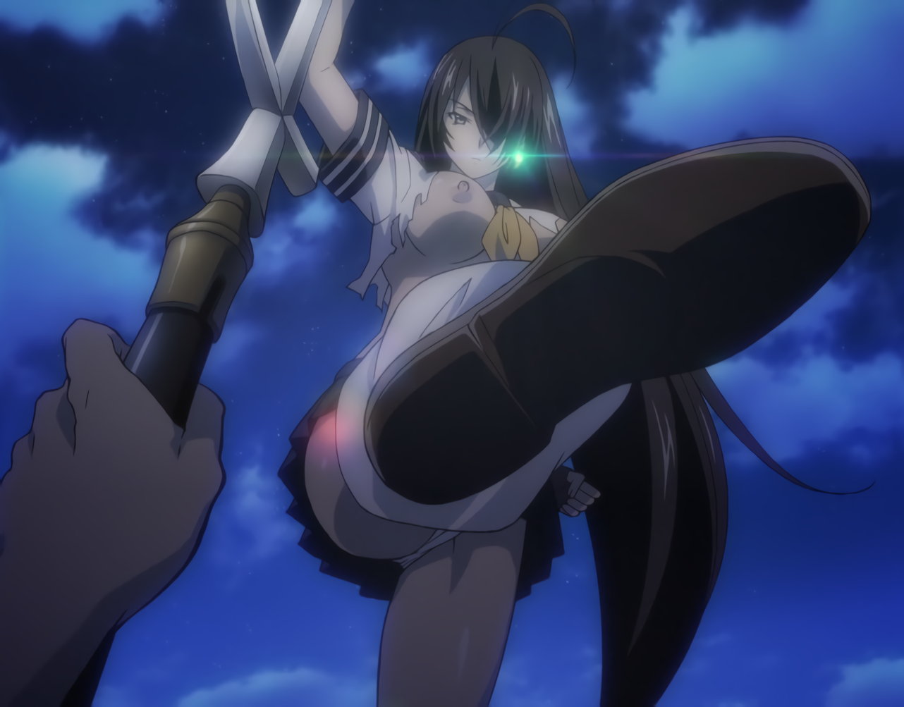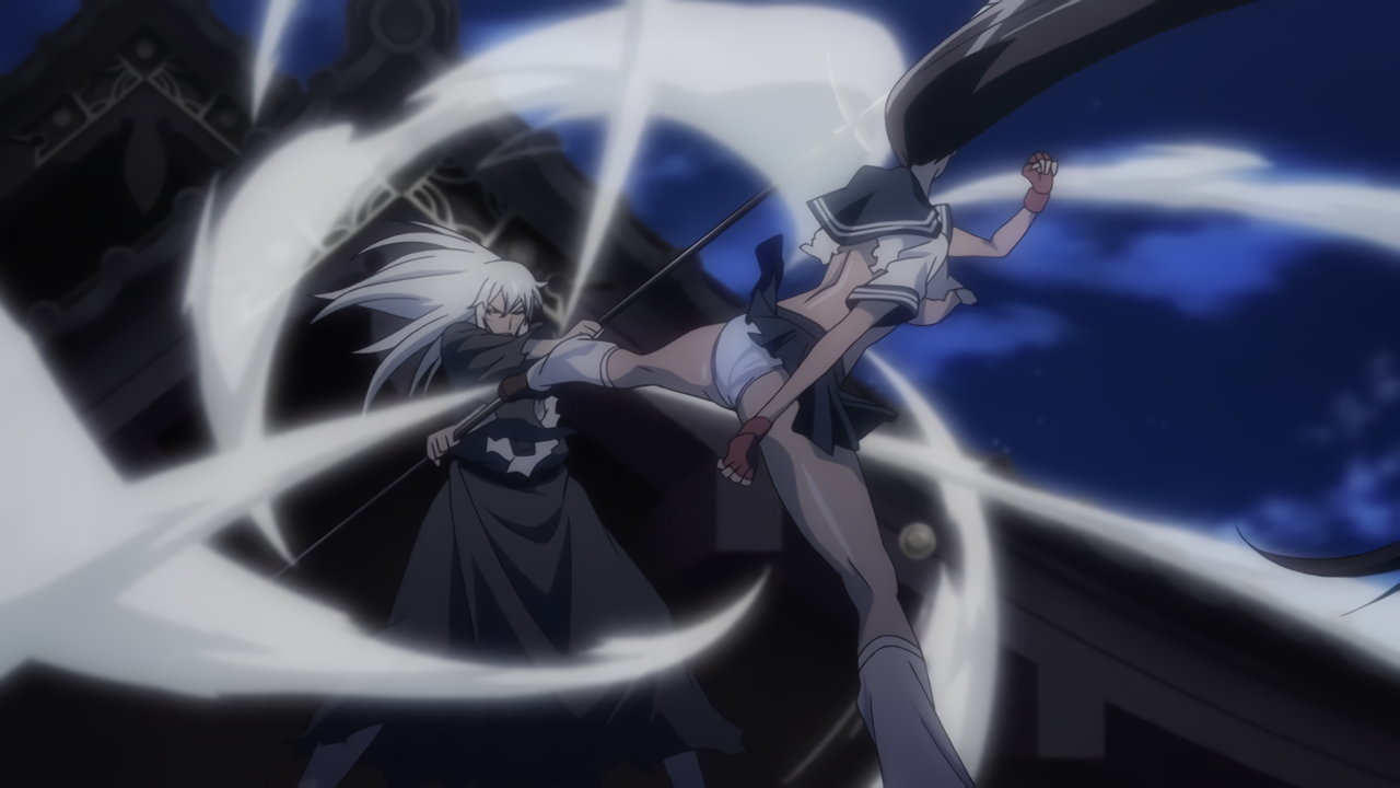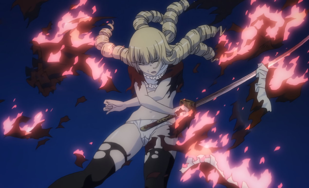 胤舜と戦う、制服中破・半裸状態の関羽。