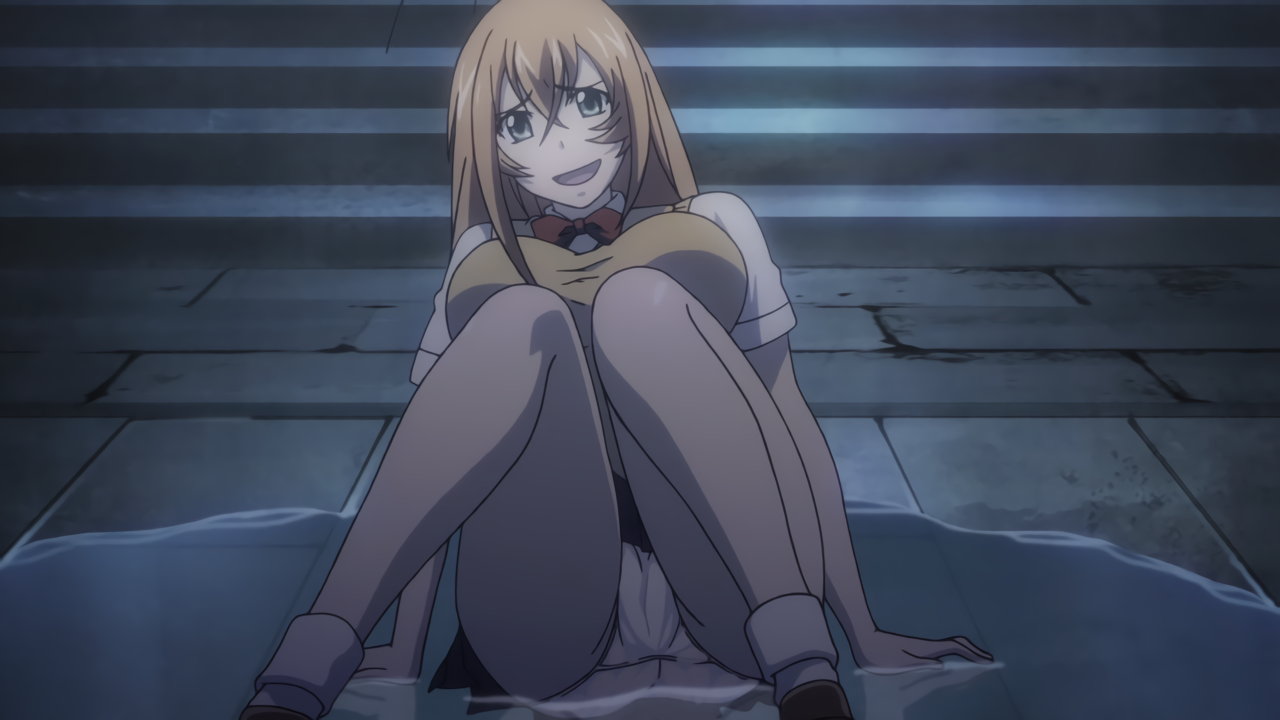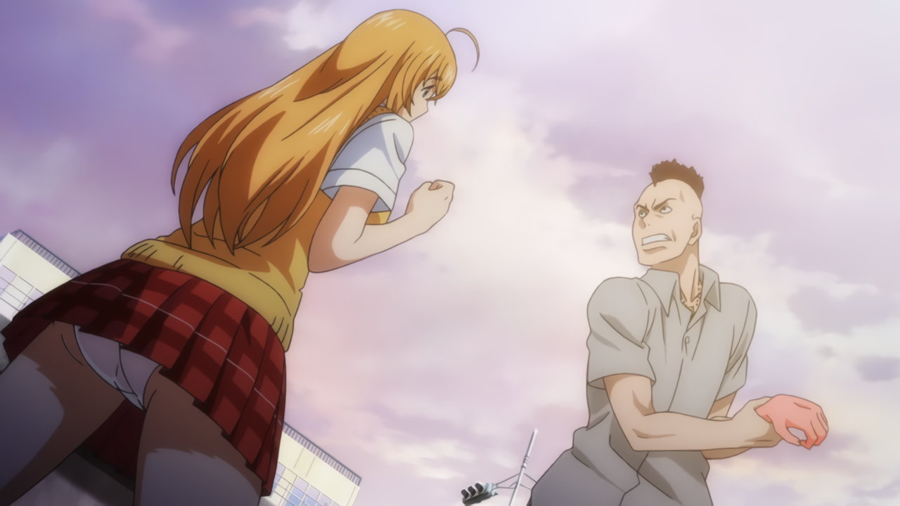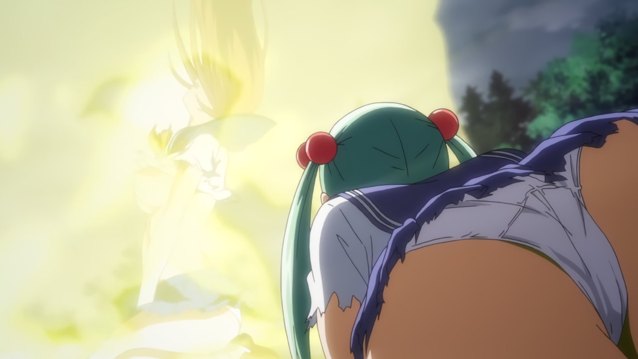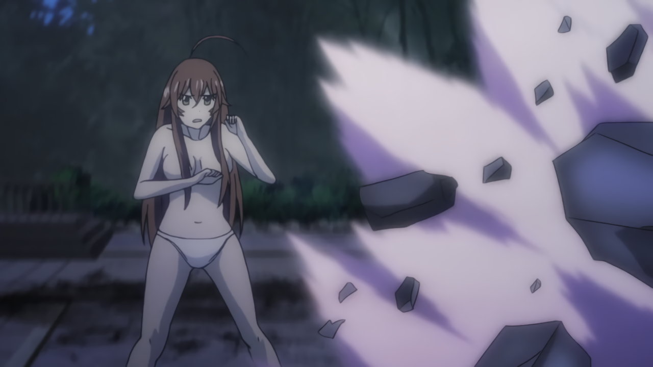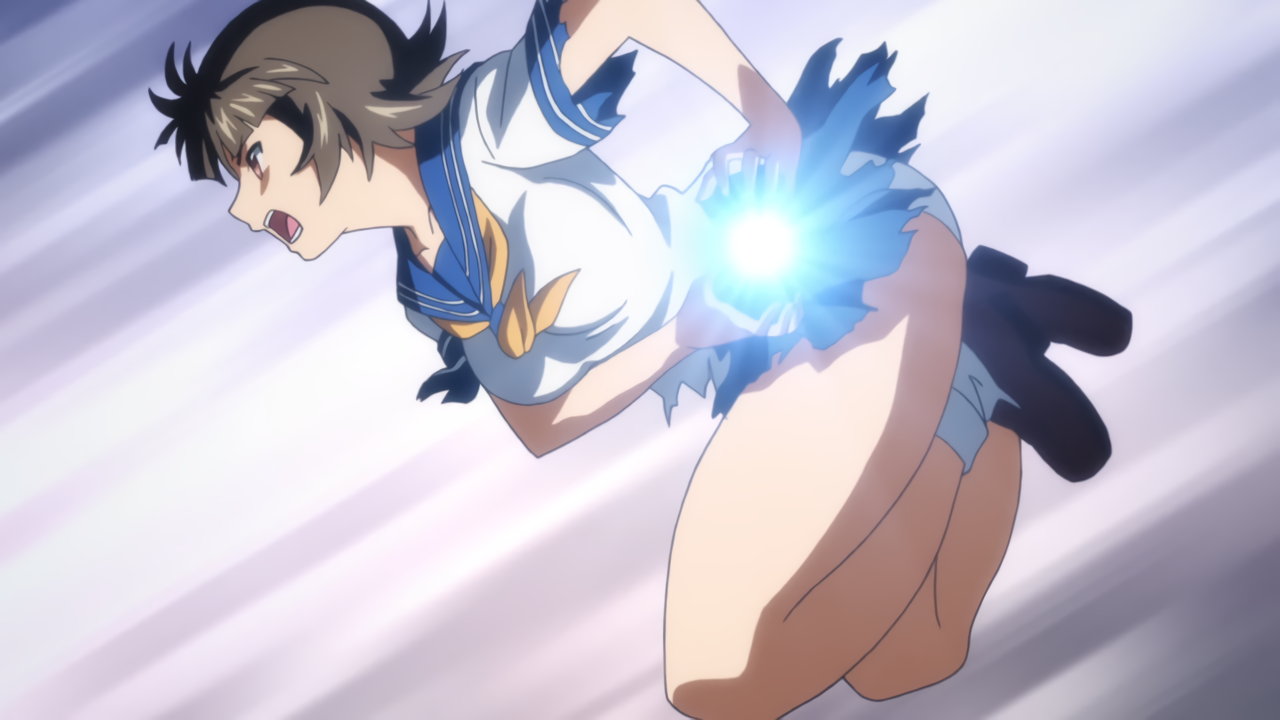 胤舜の攻撃を受け、制服破壊・下着露出する三厳。