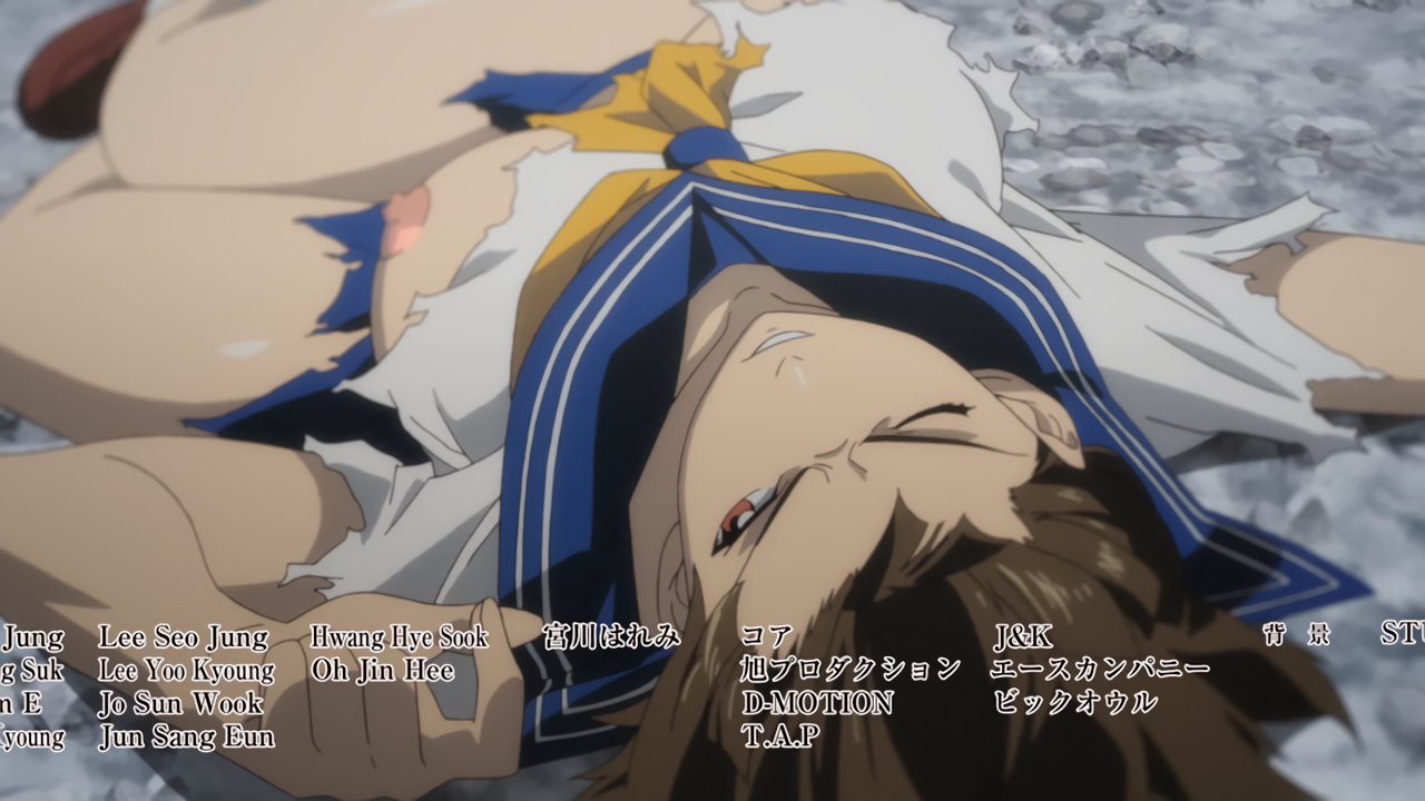 腹に焼印される、制服大破・半裸状態の女子生徒。