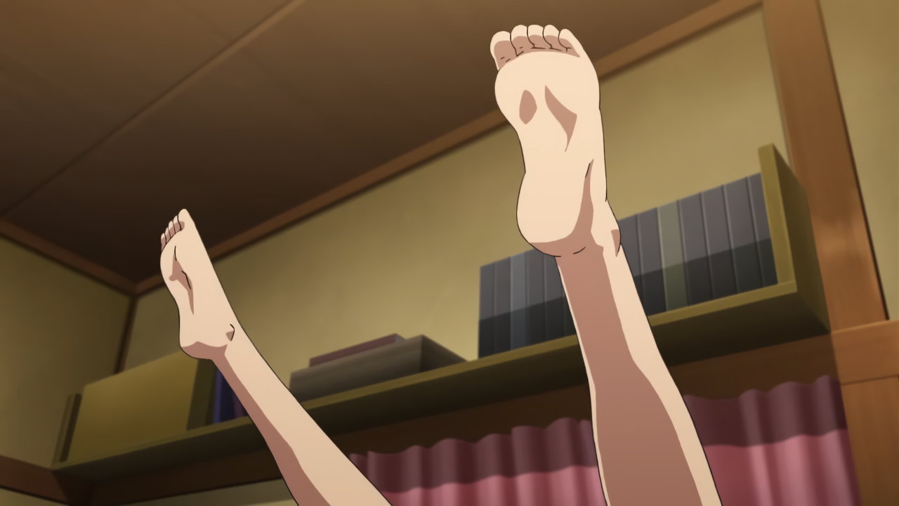 ベッドに寝転がり、生足を見せる明華。