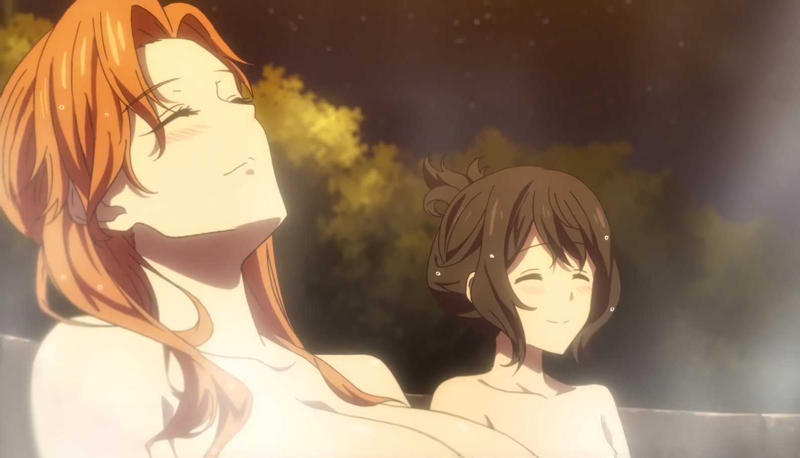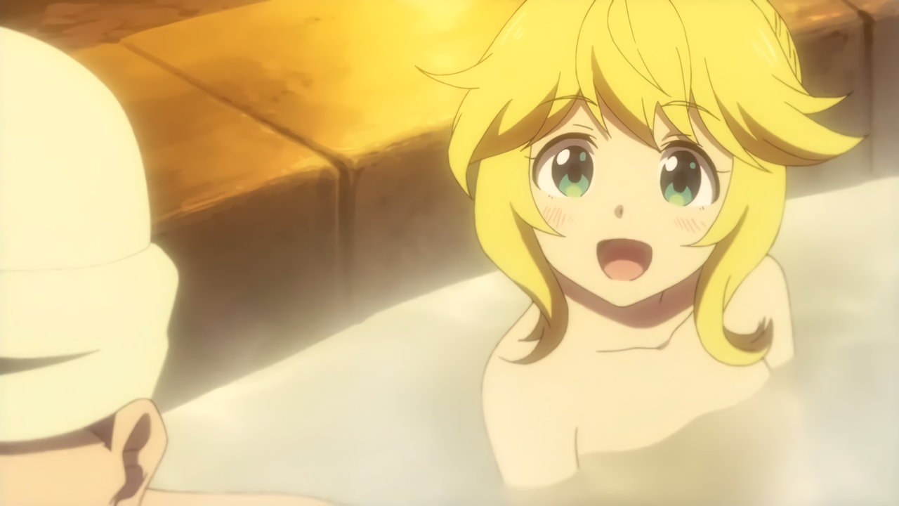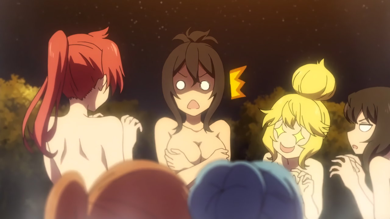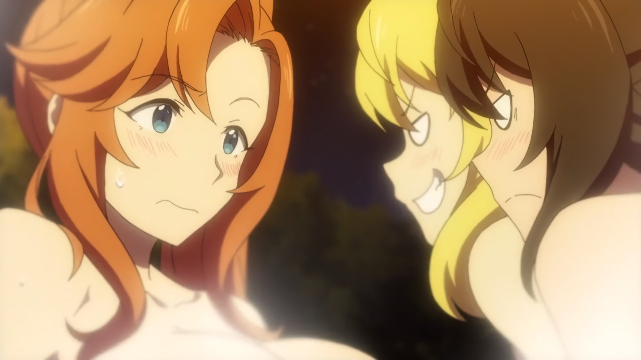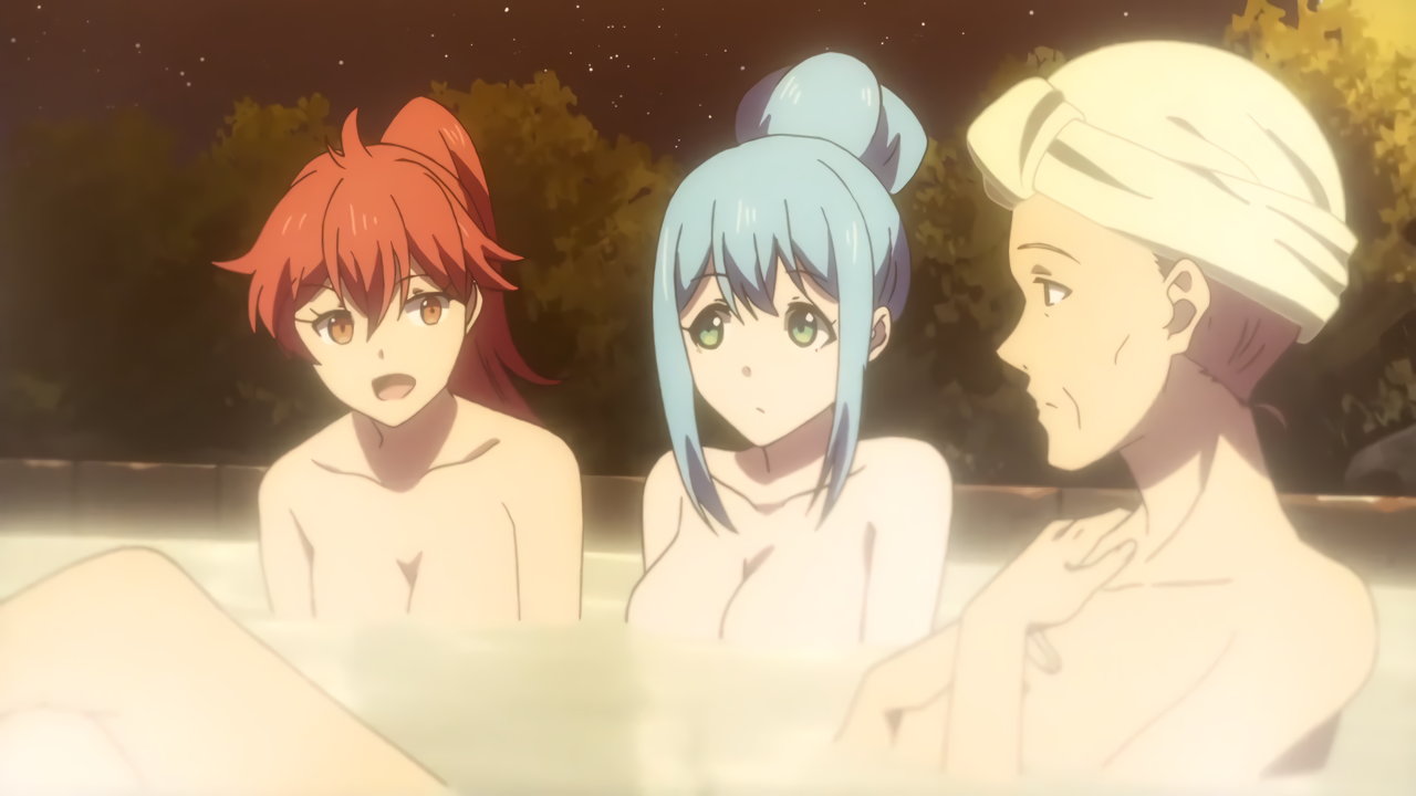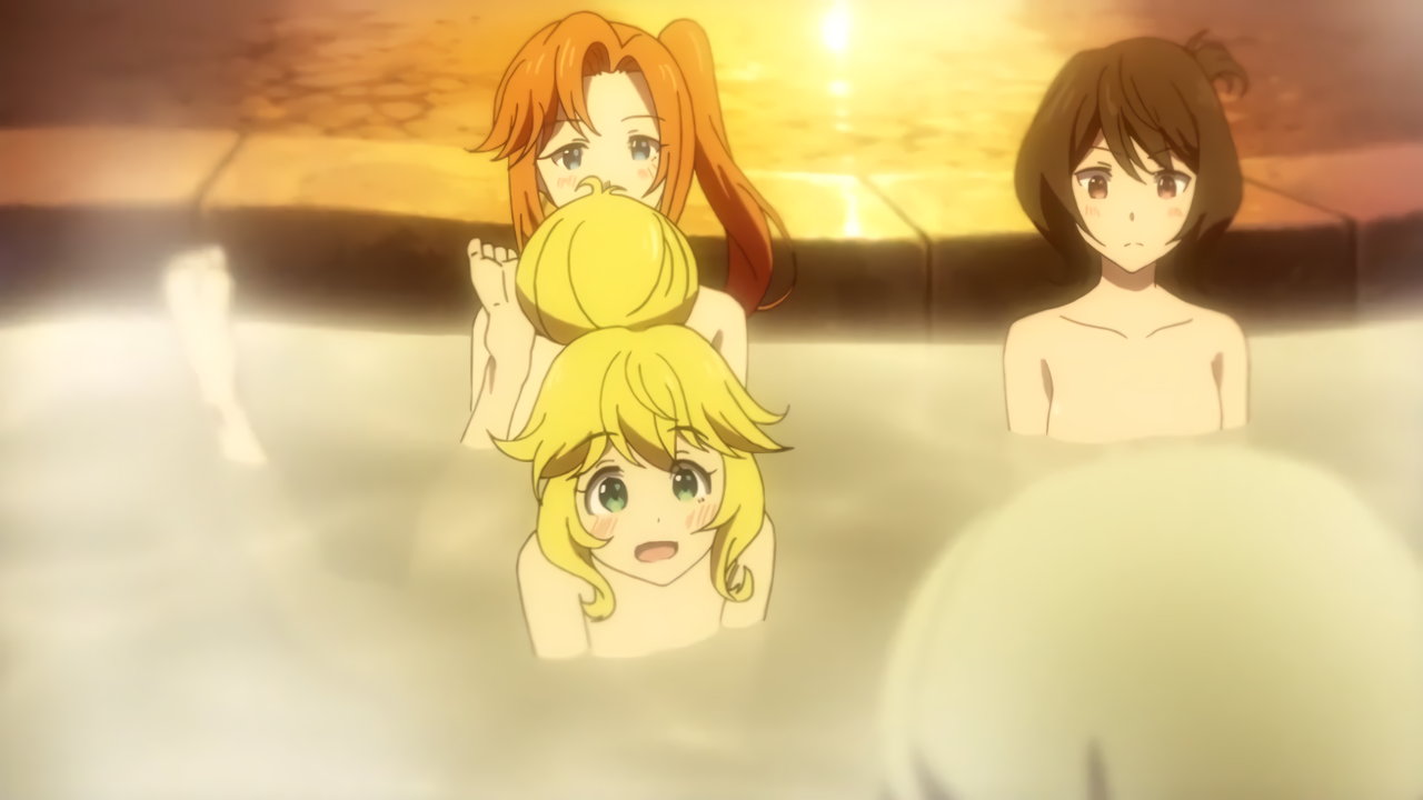 温泉入浴中の女子たち(ユーリ、オリビア、マリア、シシリー、リン、アリス)および婆さん(メリダ)
