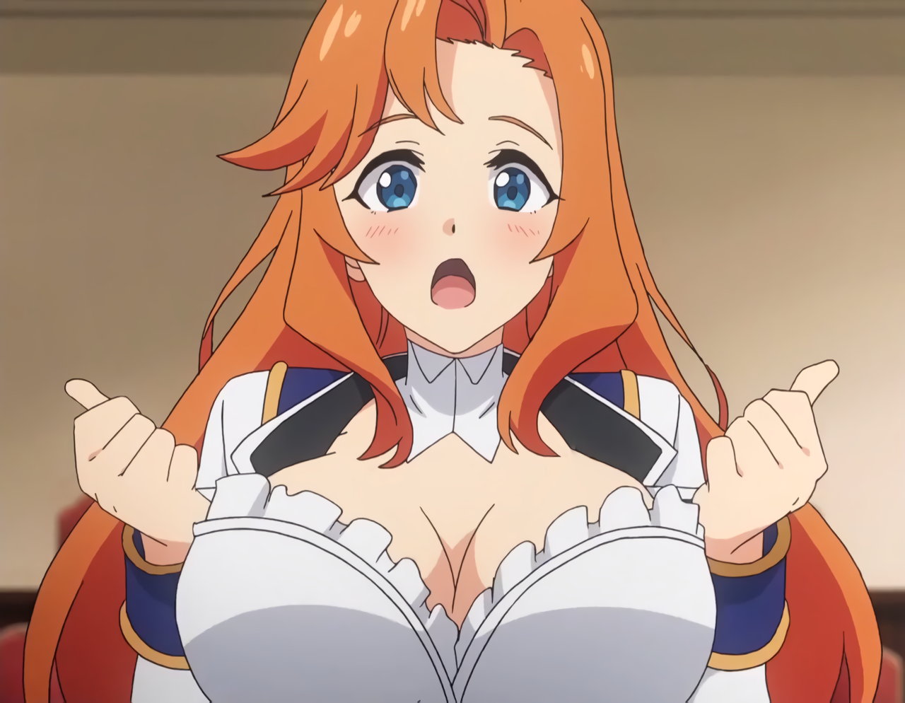 服を引っ張り、胸元・巨乳胸谷間を見せるユーリ。