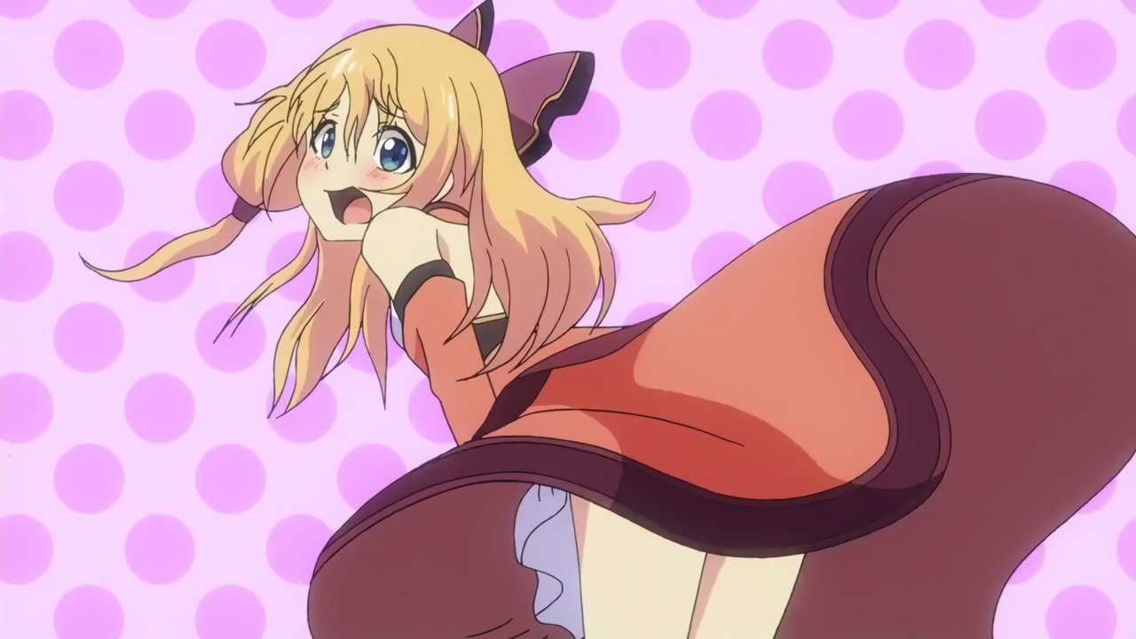 スカートをたくし上げ、ドロワーズを見せるメイ。