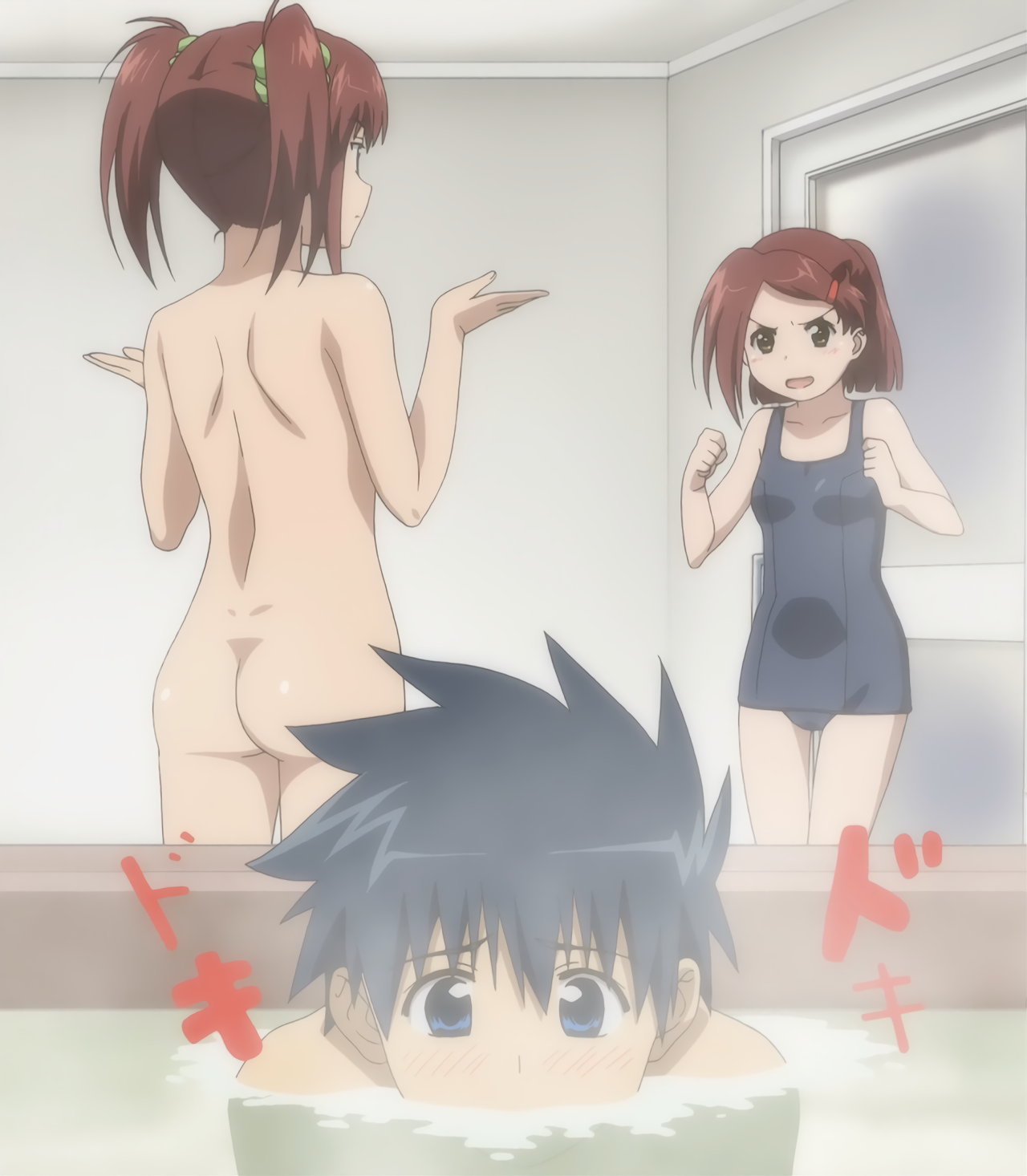 入浴中の圭太。すると、全裸りこ姉とスク水あこ姉が風呂場にやって来る。