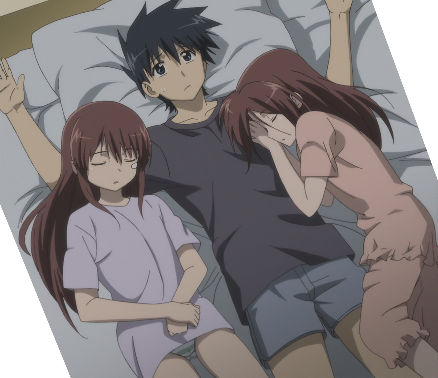 朝、起床しようとする圭太。しかし、あこ姉とりこ姉に挟まれているため、起き上がれない。