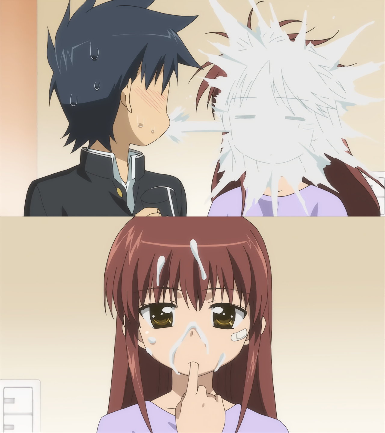 ヨーグルトドリンクを吐いて、りこ姉の顔を白濁液塗れにする圭太。