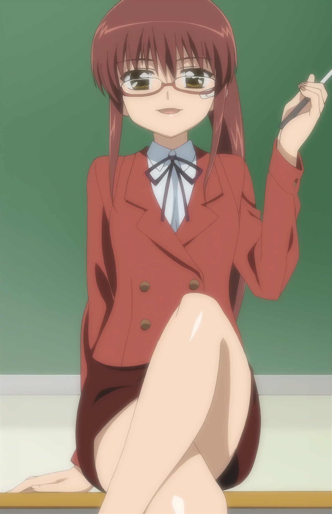 足を組んで生脚を見せる、女教師姿のりこ姉。