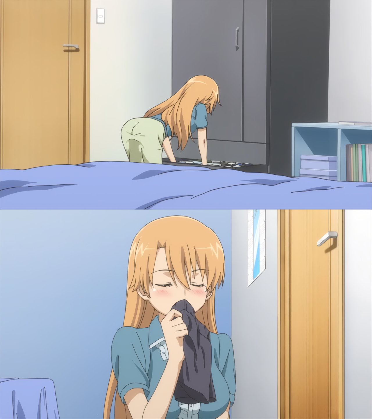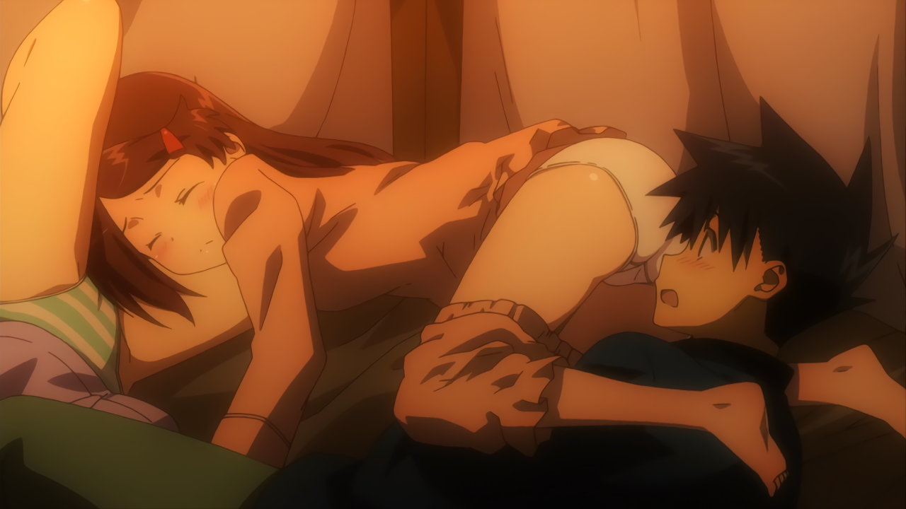 尻を見せながら、圭太にキスするりこ姉。なお、りこ姉の寝間着はTシャツ一枚のため、下半身はパンツ丸出しの格好となっている。