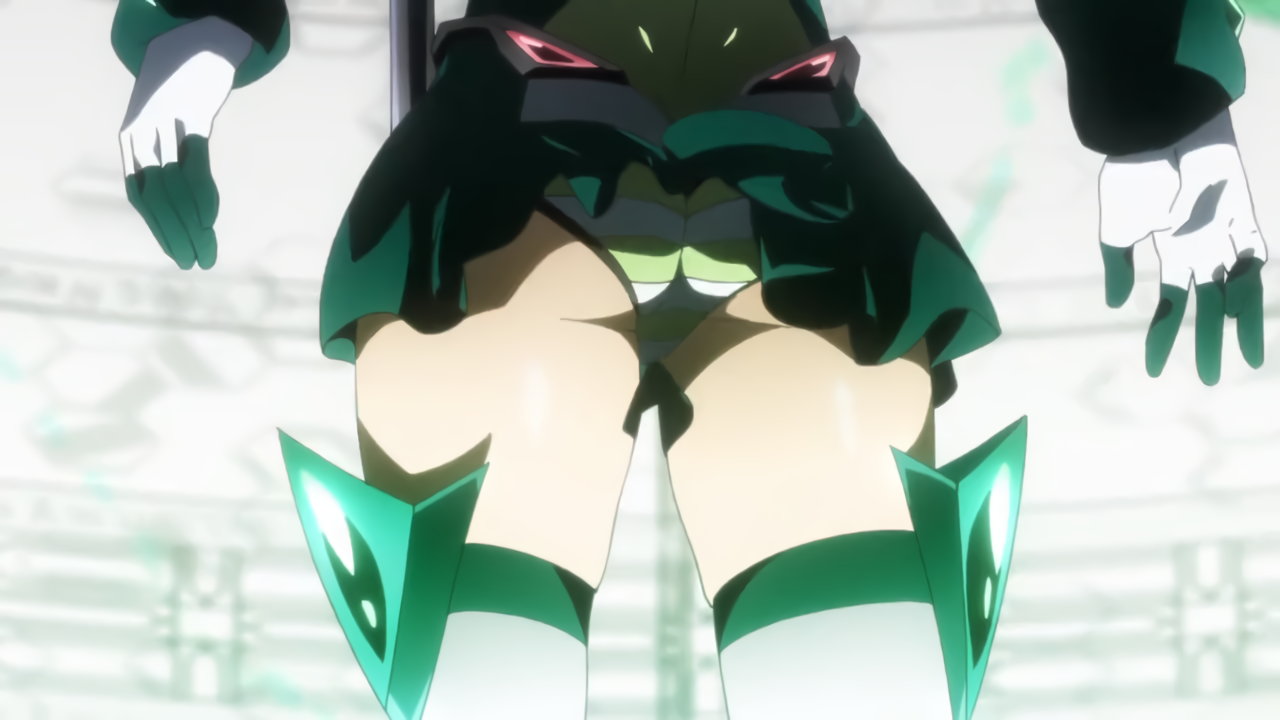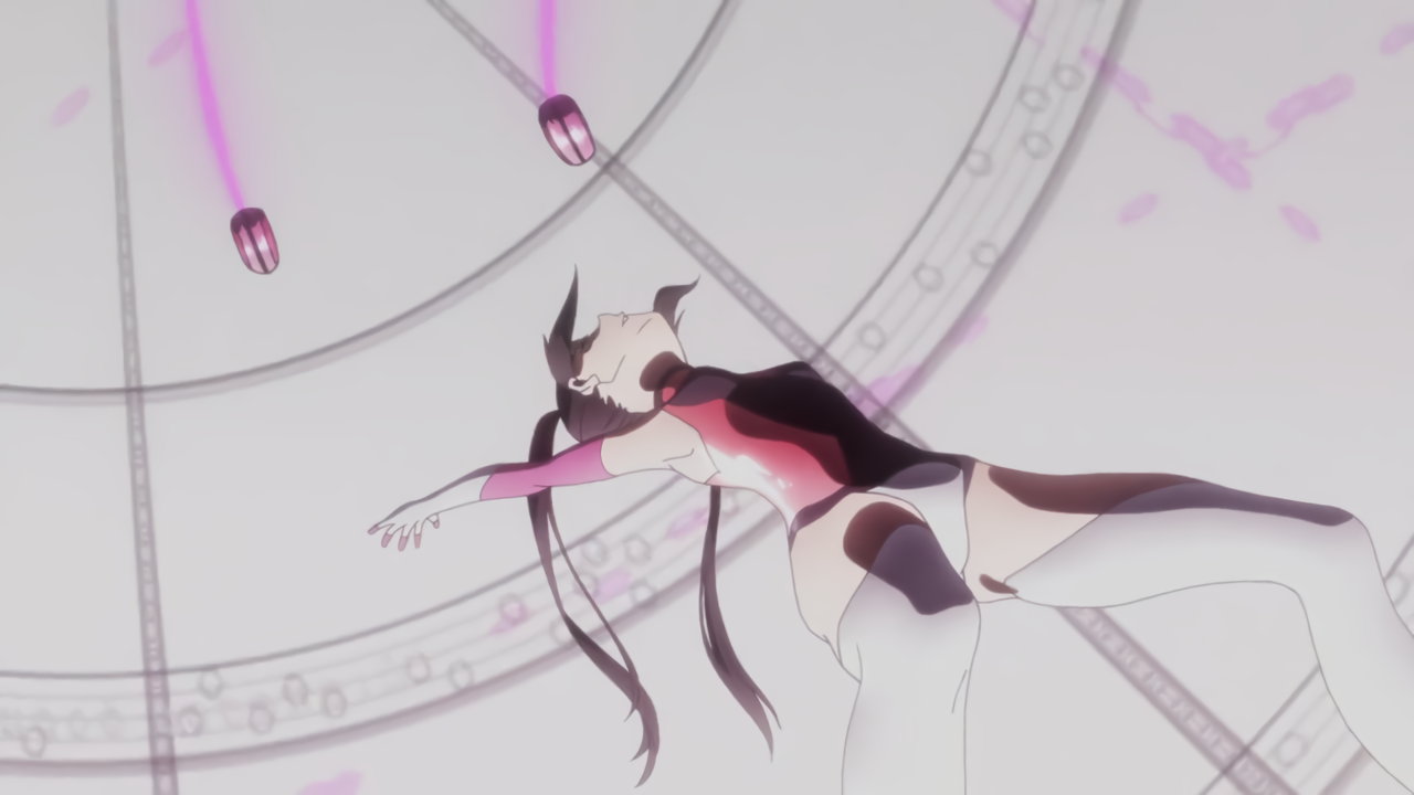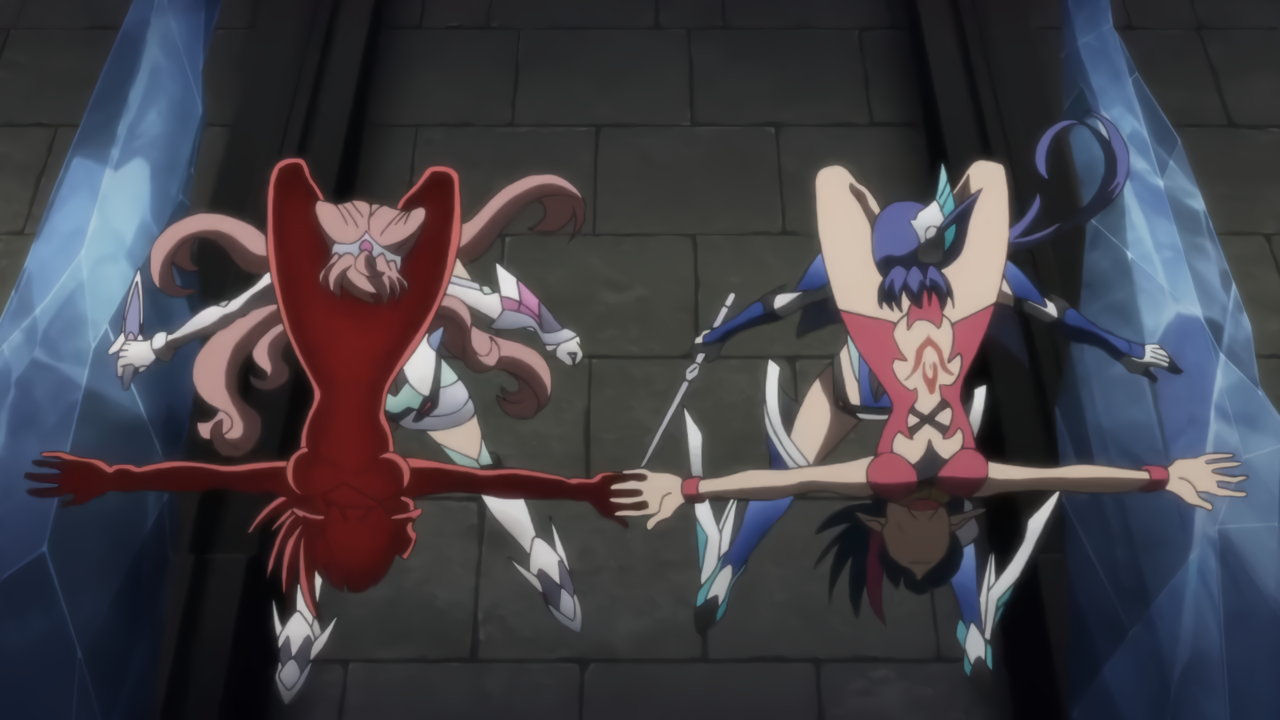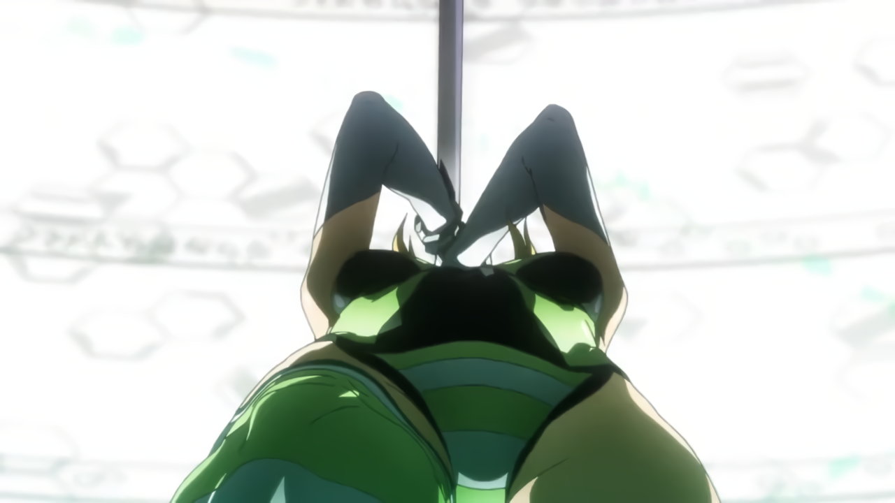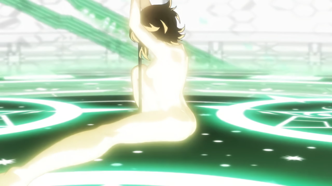 切歌の変身バンクシーン。パンチラしながらポールダンスしているように見える。