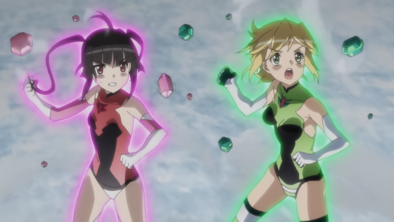レオタード姿で戦う調と切歌。切歌の下半身は縞パンのように見える。
