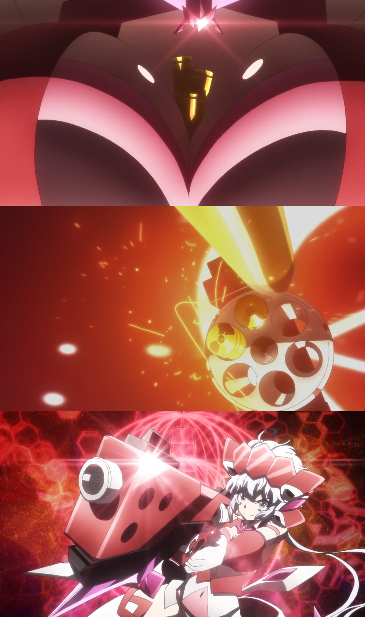 クリスの変身バンクシーン。巨乳胸谷間から銃弾を取り出し、リボルバーに装填する。
