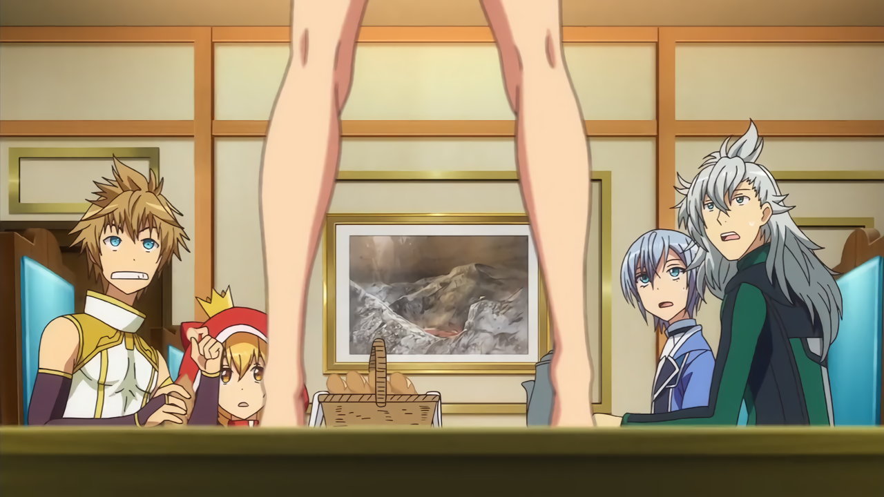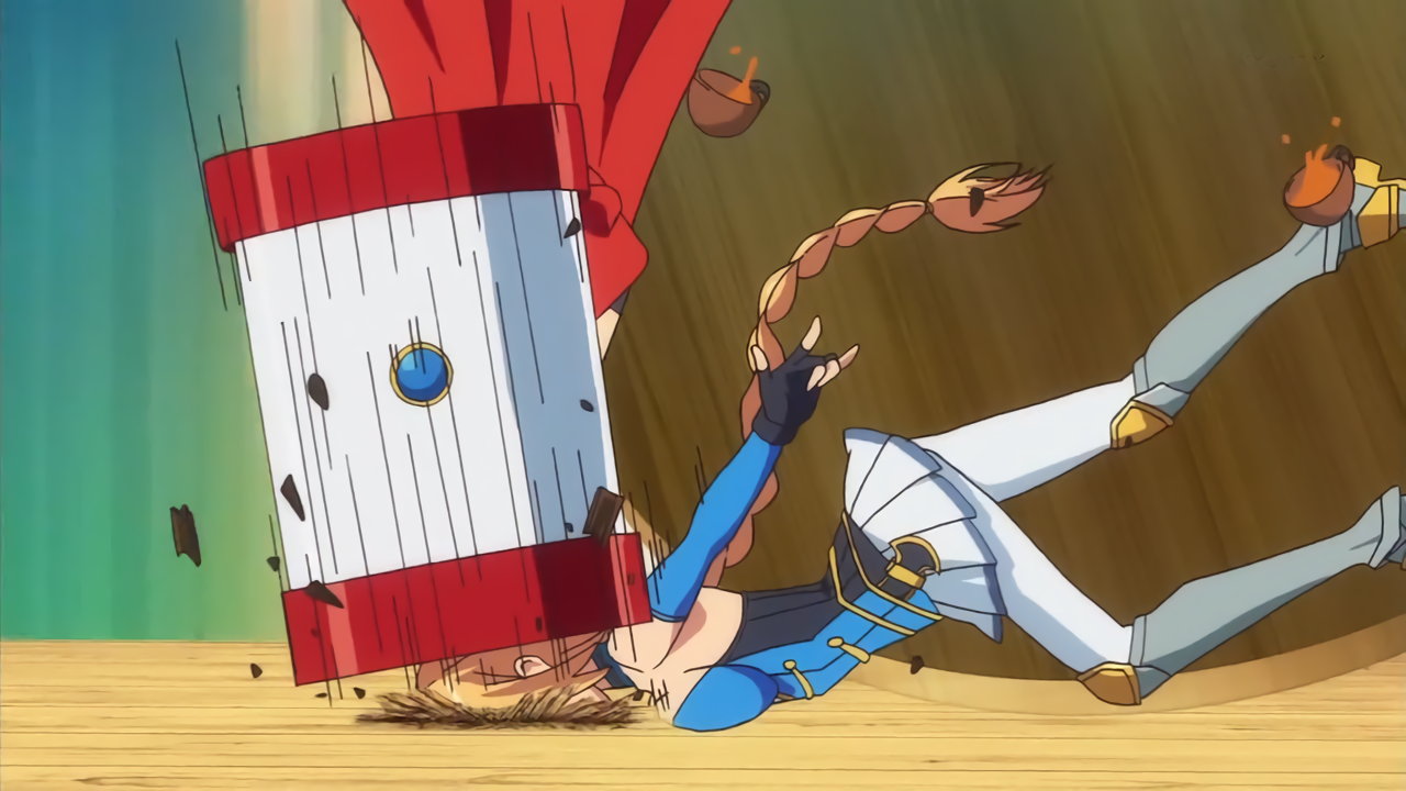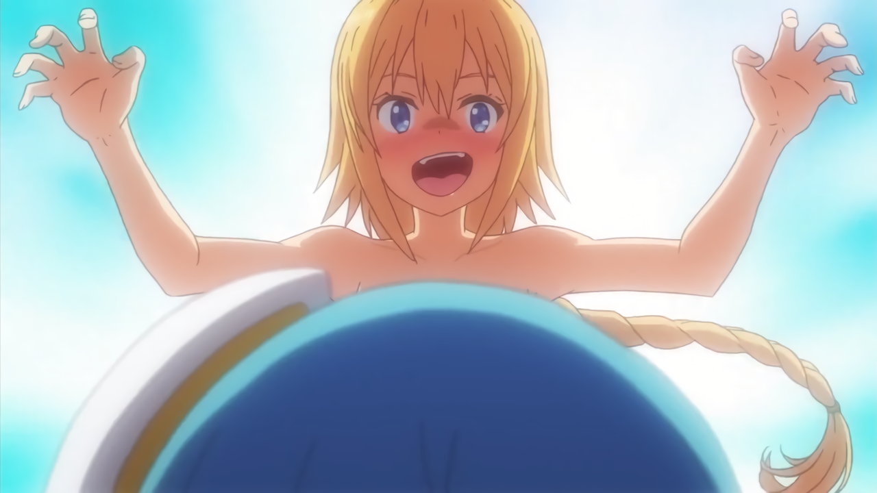 料理対決中、衣服破裂・全裸化エロリアクションをする団長。