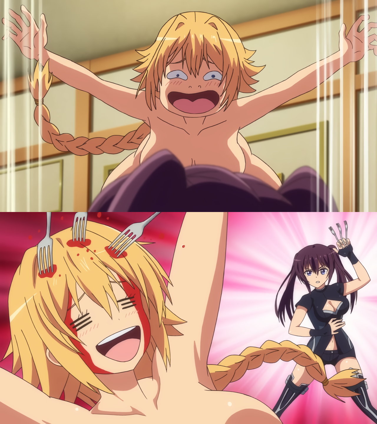 服を破かれ、全裸化する山猫と錬金。