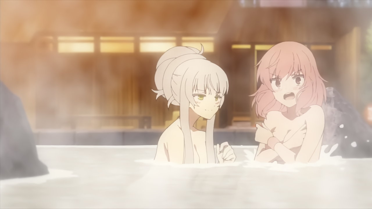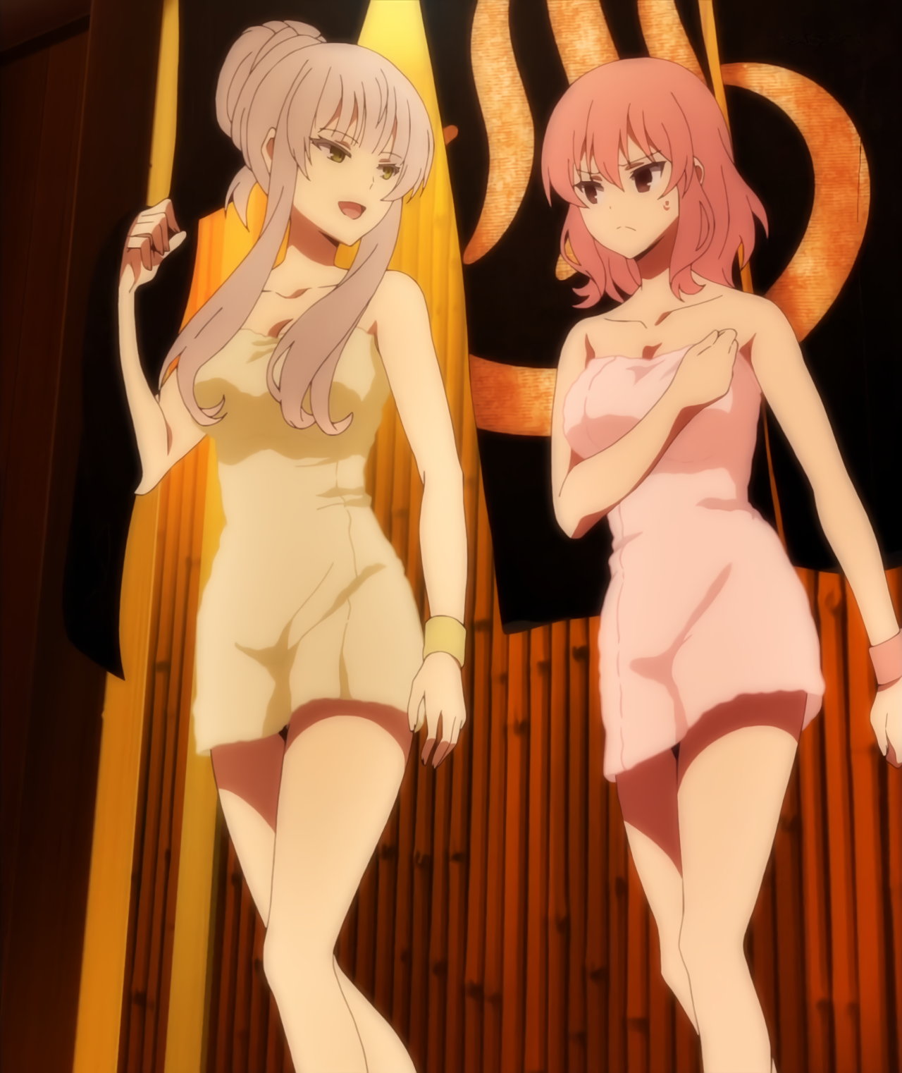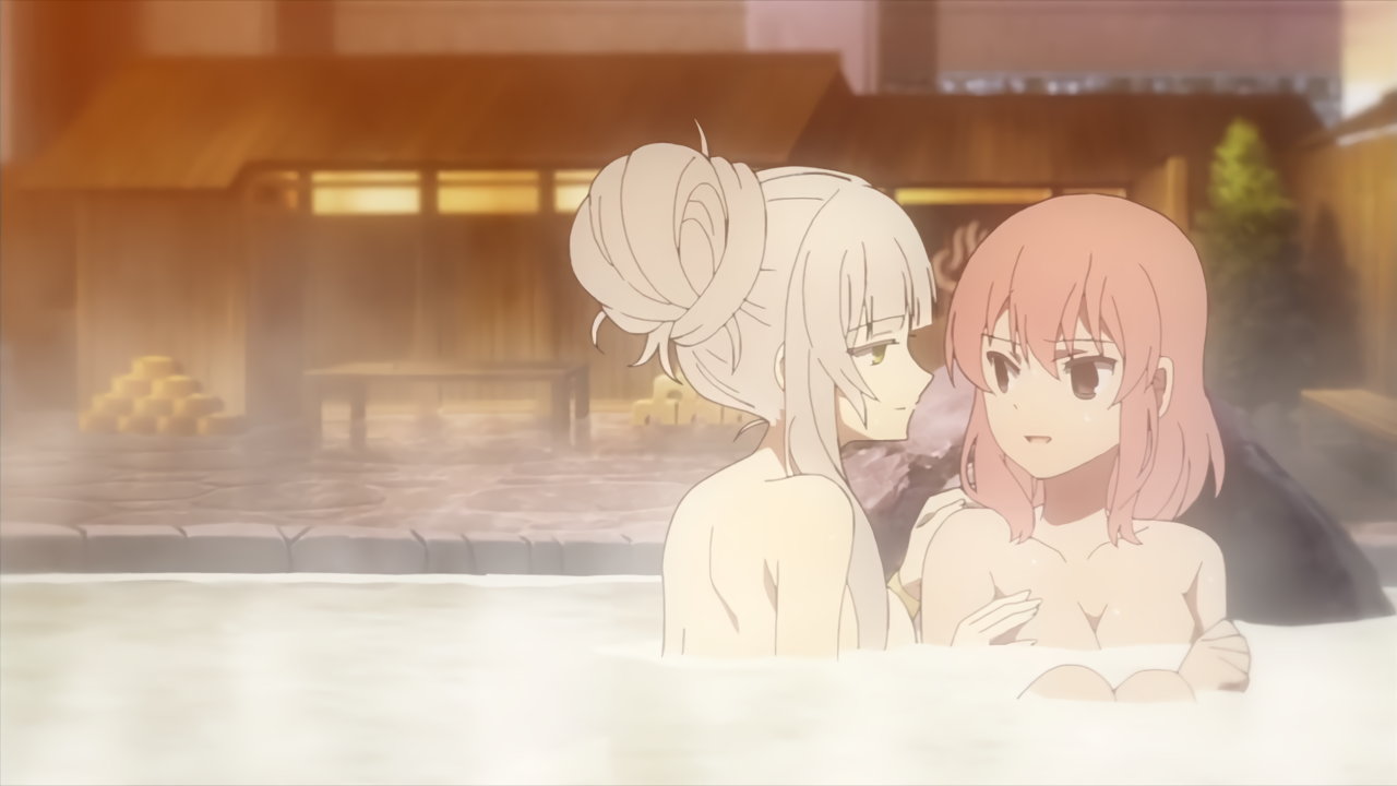 露天風呂入浴中・裸バスタオル姿のカリンとユズ。