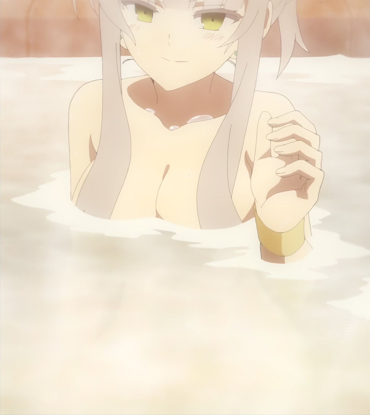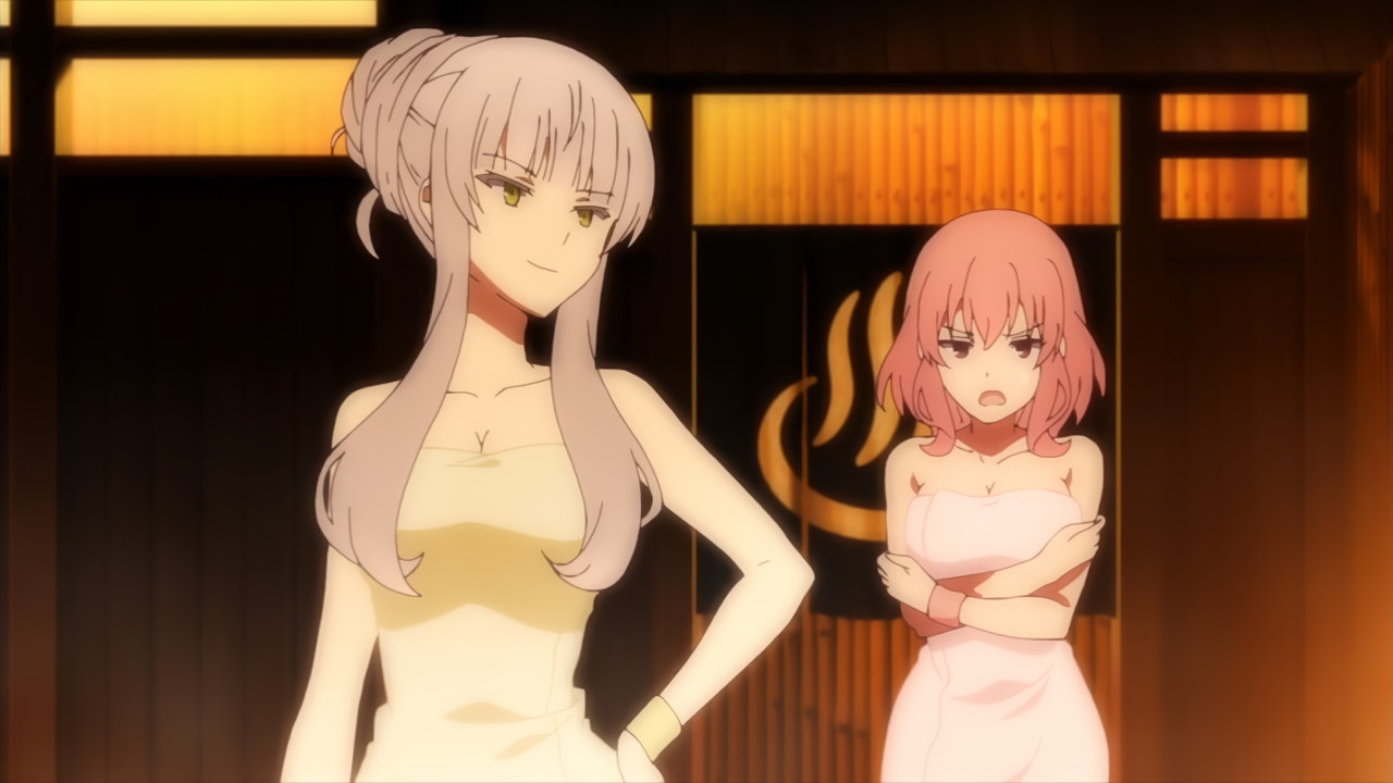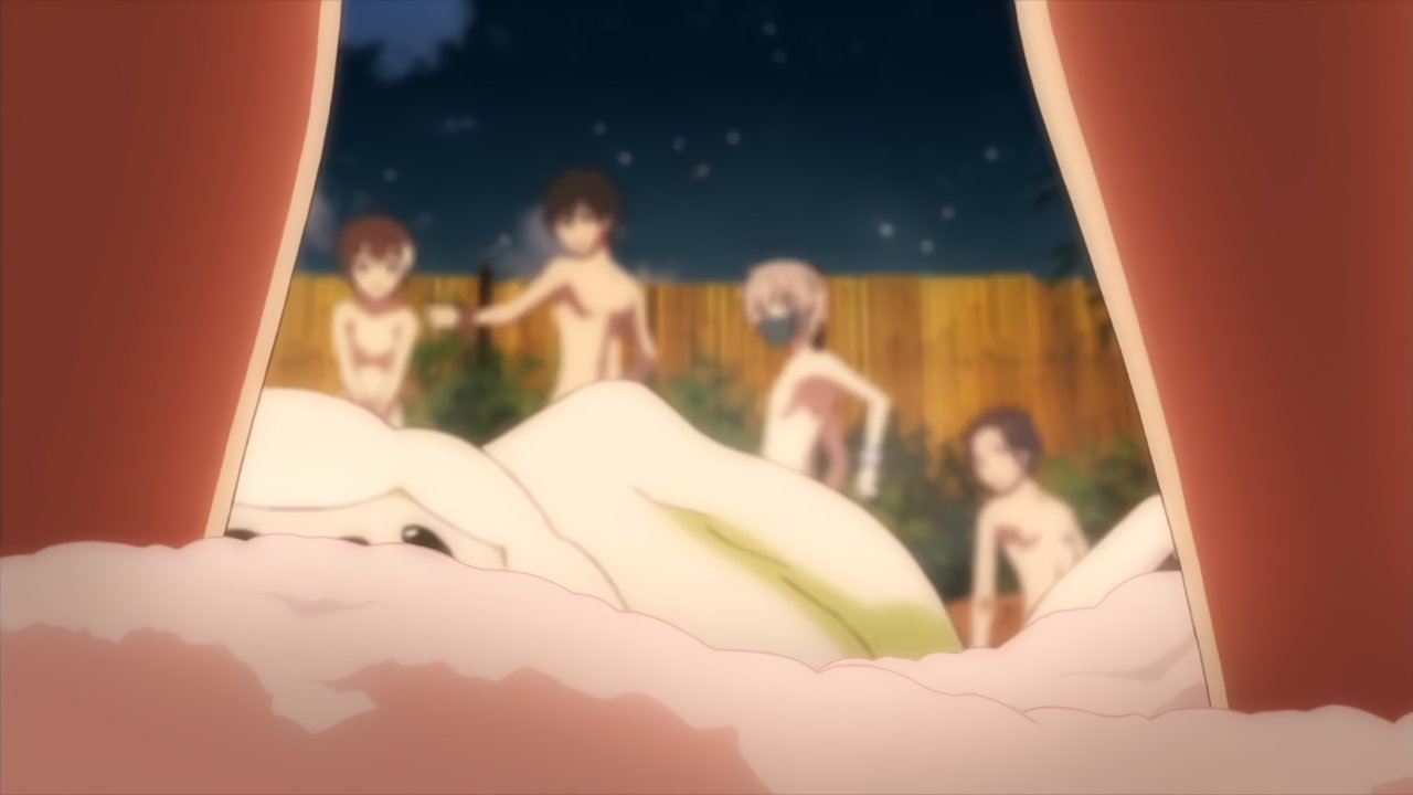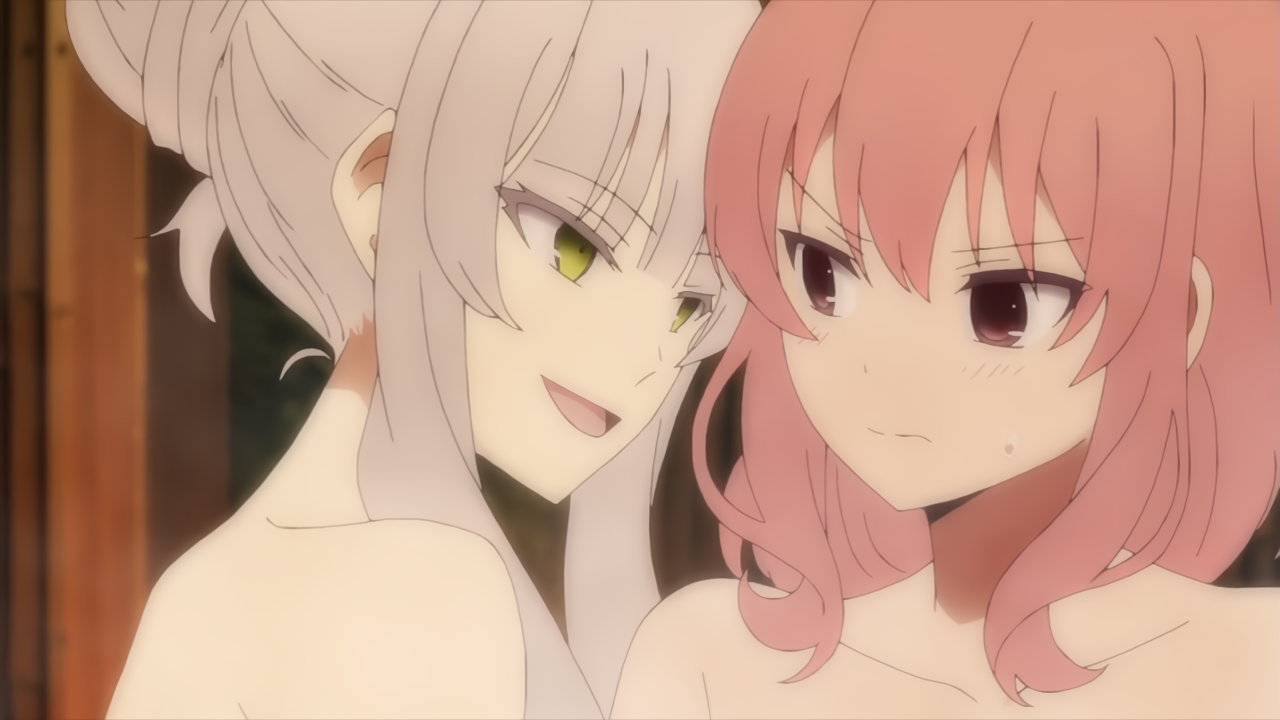 露天風呂入浴中・裸バスタオル姿のカリンとユズ。