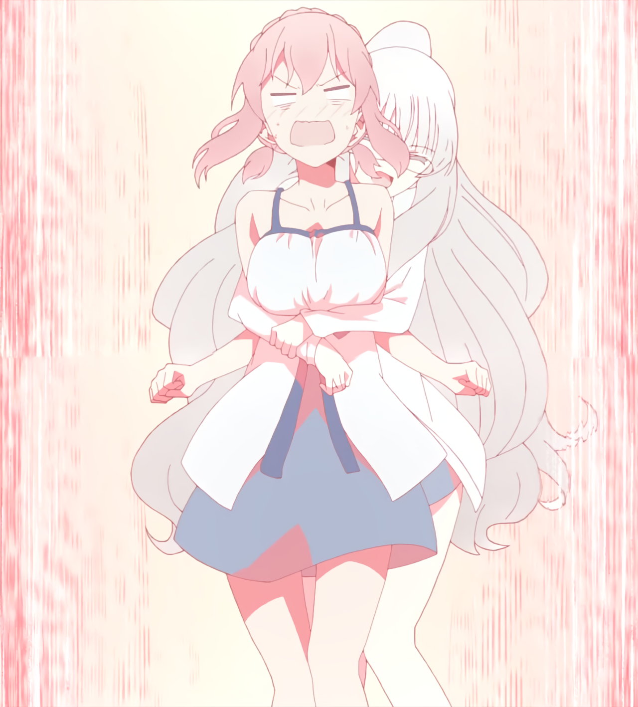 ユズに抱きつかれ、困惑するカリン。