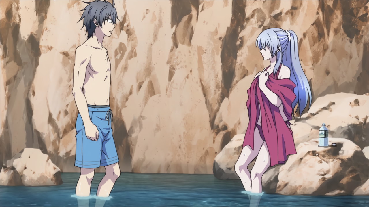 岩陰に隠れて密着実験を開始しようとする、心夜と菖蒲。