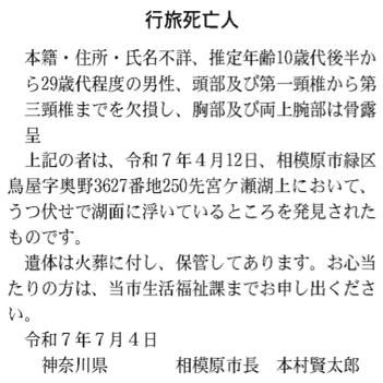上記の者は、令和7年4月12日、相模原市緑区鳥屋字奥野3627番地250先宮ヶ瀬湖上において、うつ伏せで湖面に浮いているところを発見されたものです。