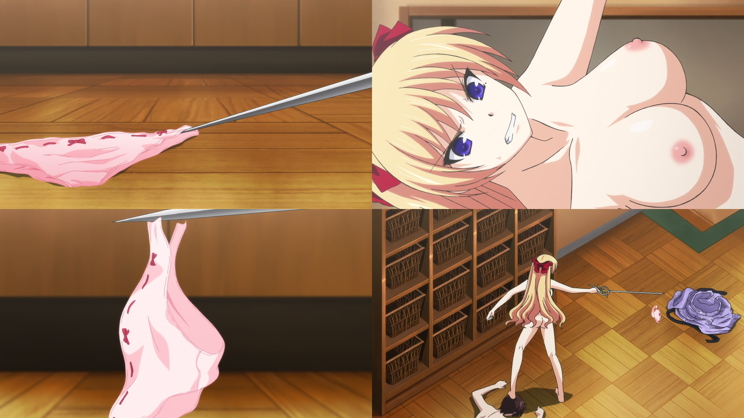 剣先でパンツを拾おうとする全裸クリスティアーネ。しかし、パンツが切れてしまう。