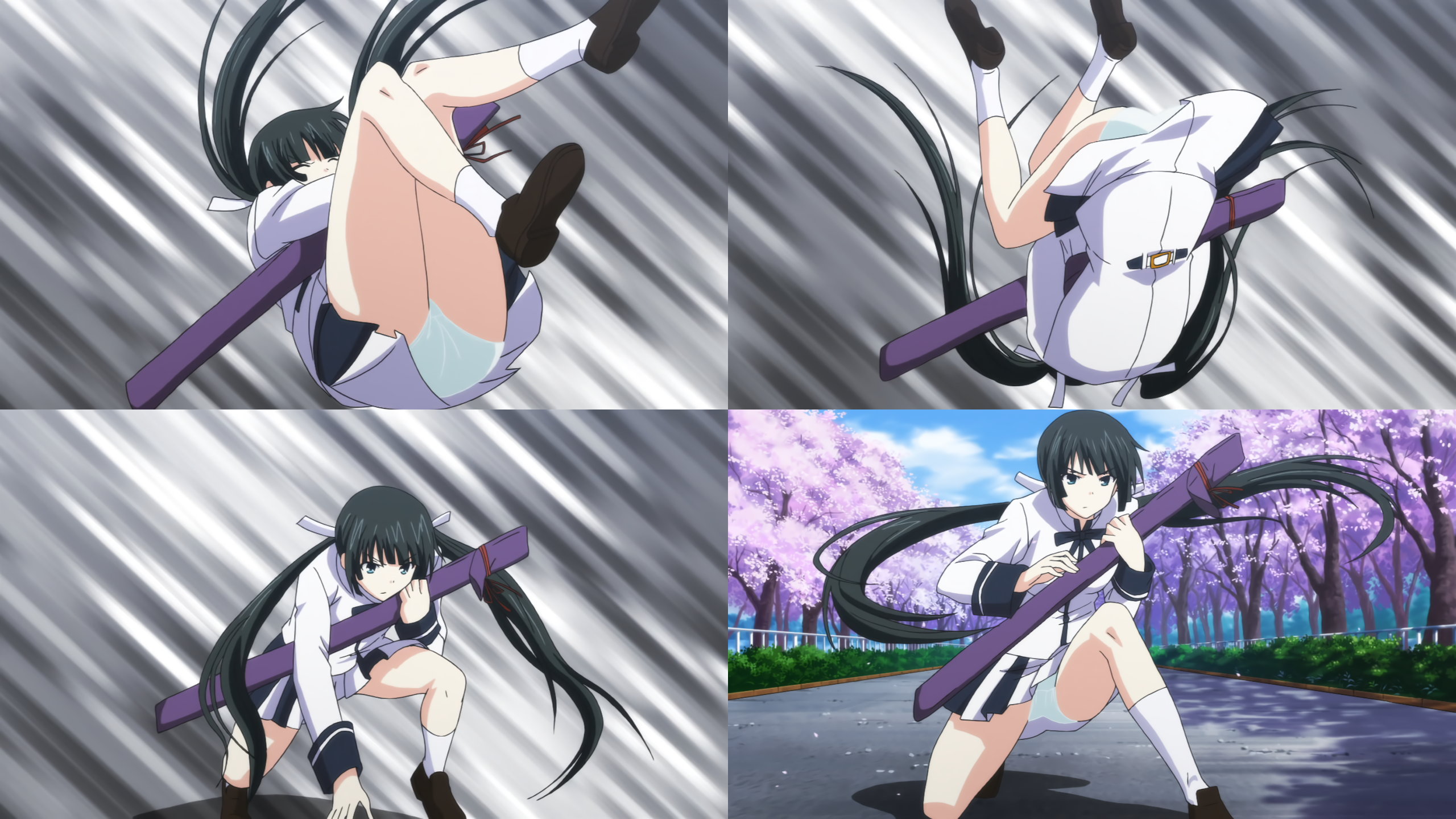 パンチラしながら回転・着地する由紀江。