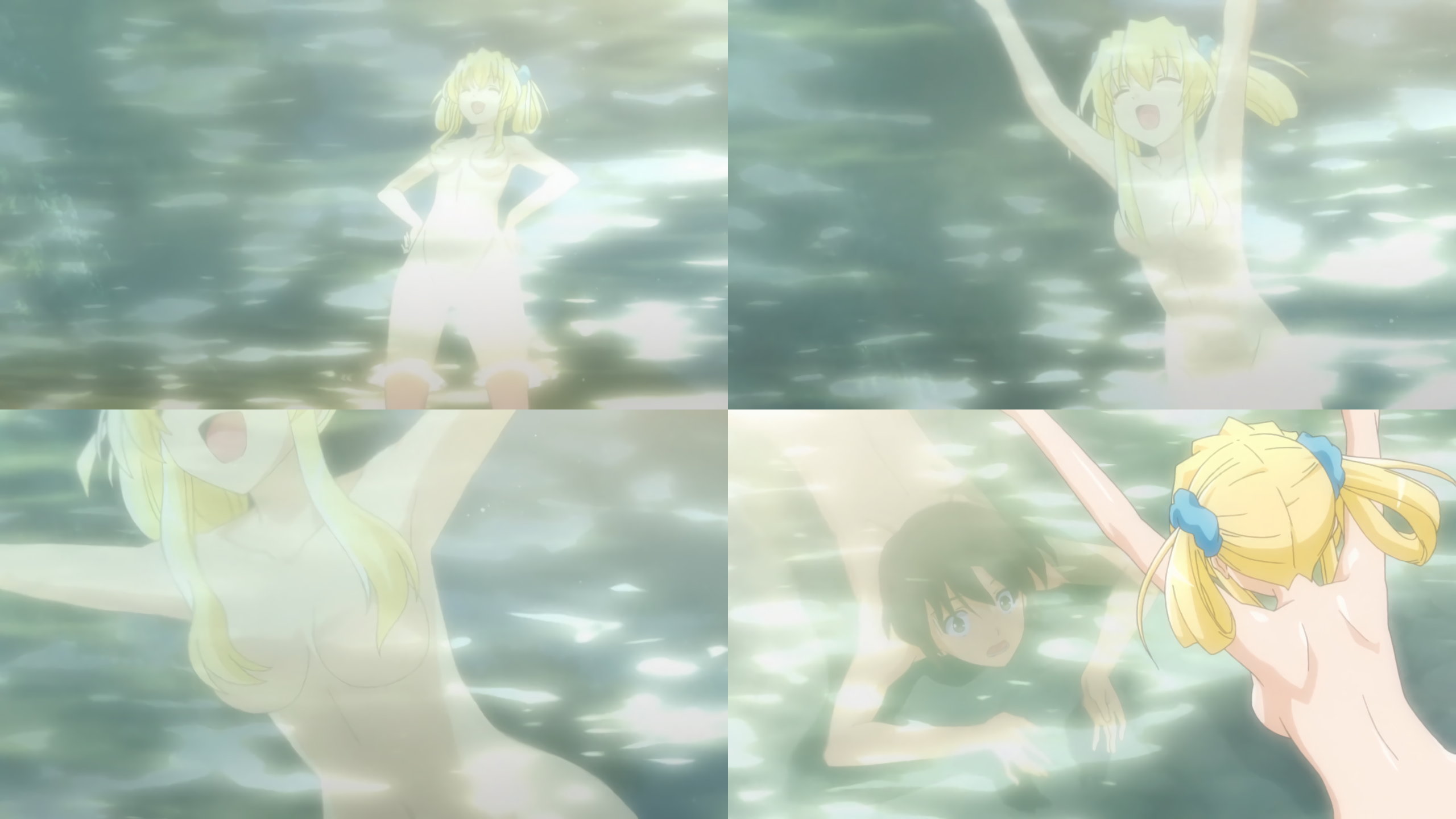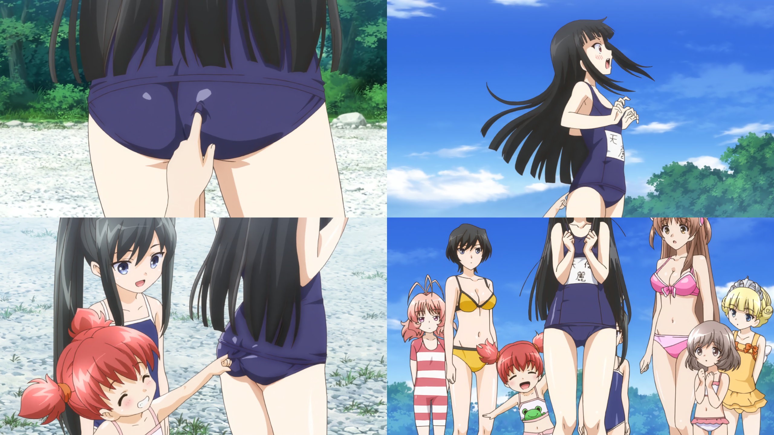 立夏を肩車しながら浮上する陽太郎。陽太郎のフルチン股間を目撃する姉妹たち。