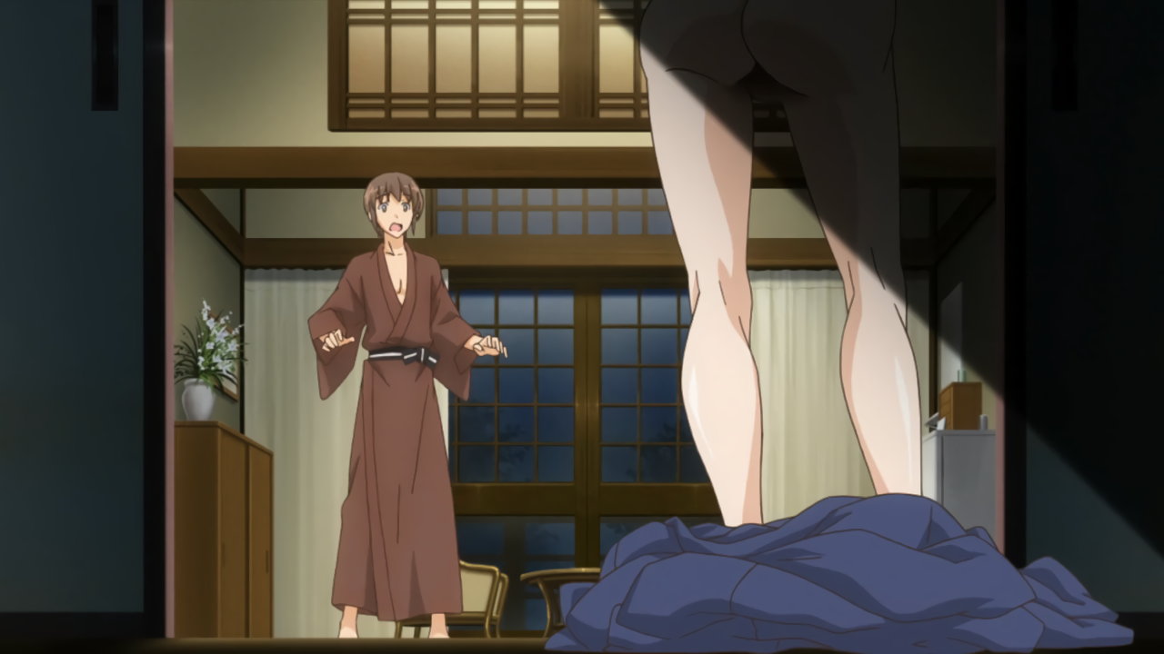 陽太郎の部屋へ夜這いに来た春風。脱衣後、体にローションを塗り始める。