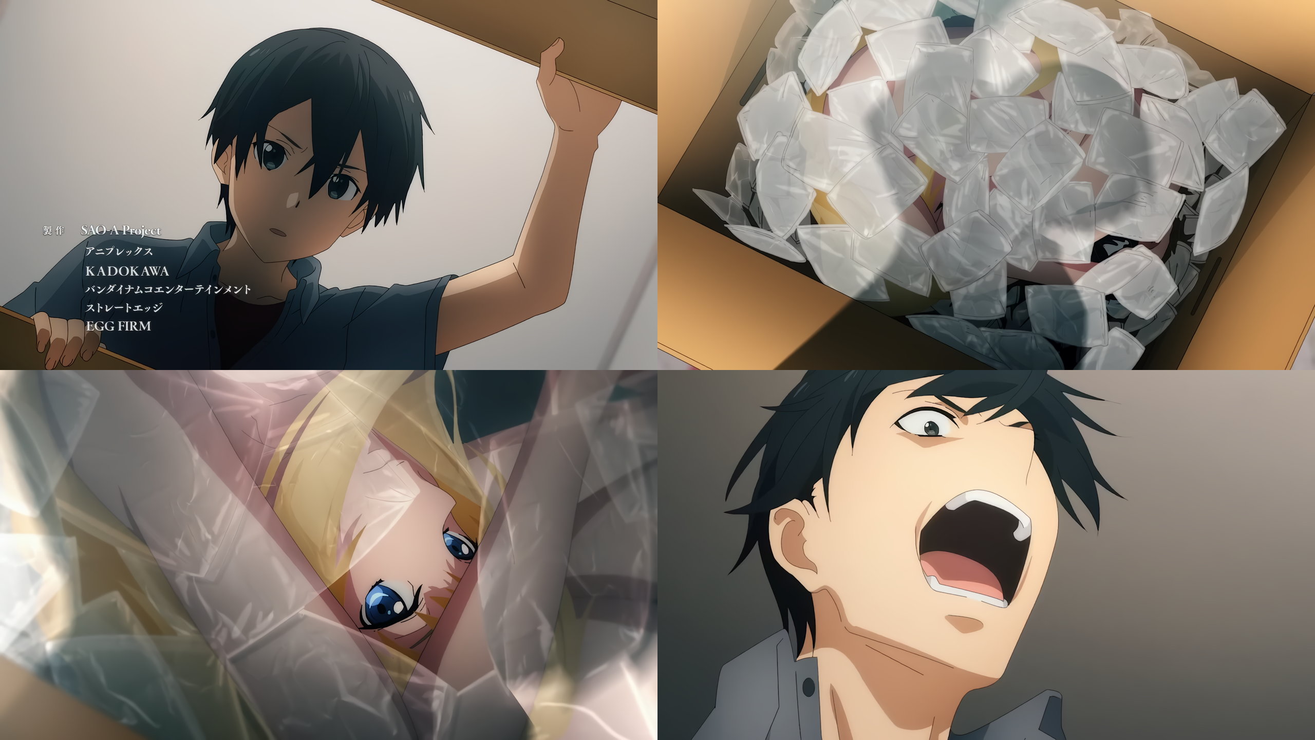 自宅に届いた謎の荷物を開梱するキリト。箱の中には、全裸のアリスが入っていた。