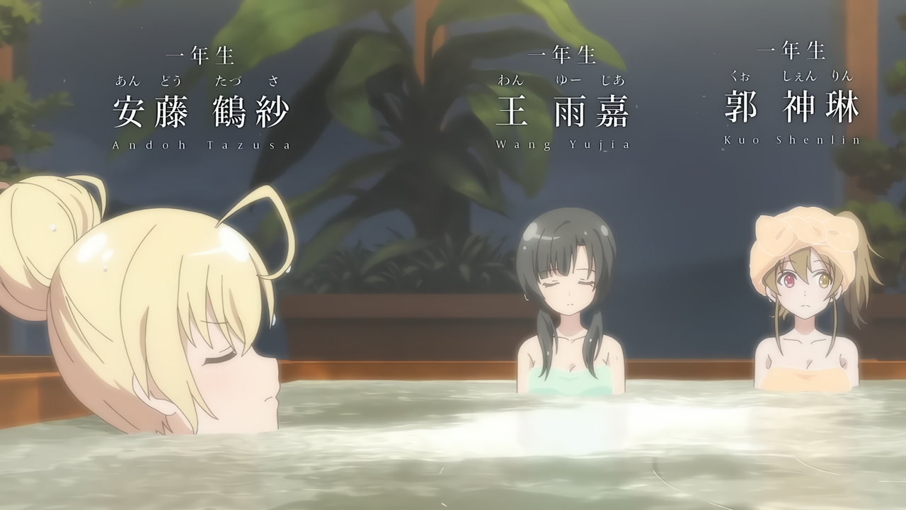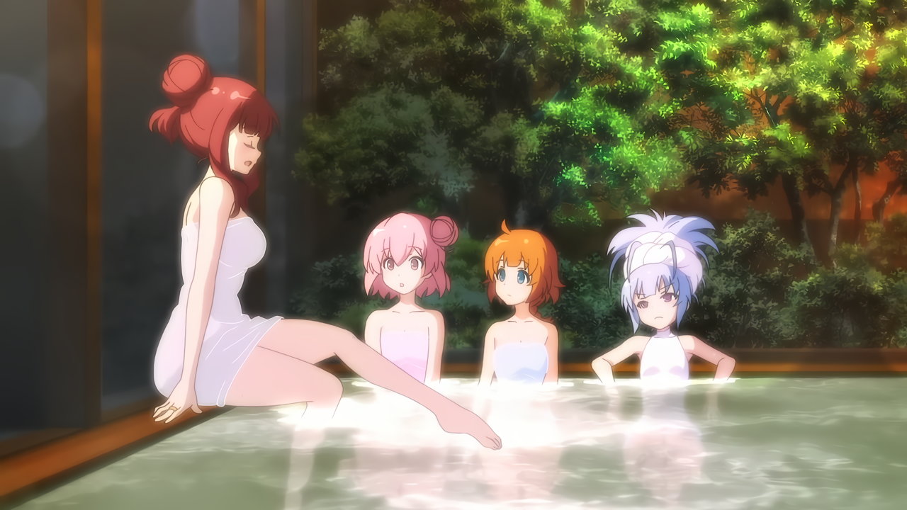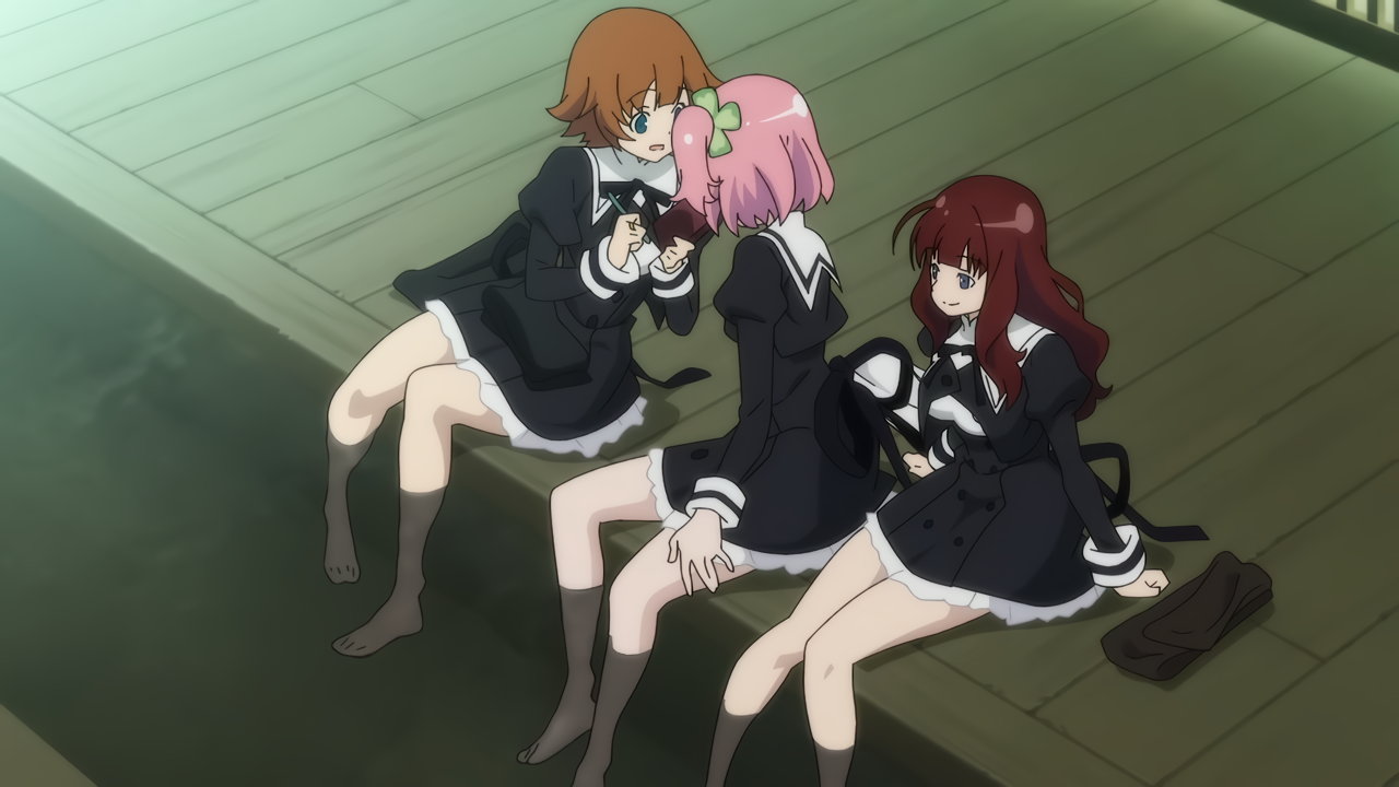 足湯に浸かる梨璃、楓、二水。生脚がエロい。