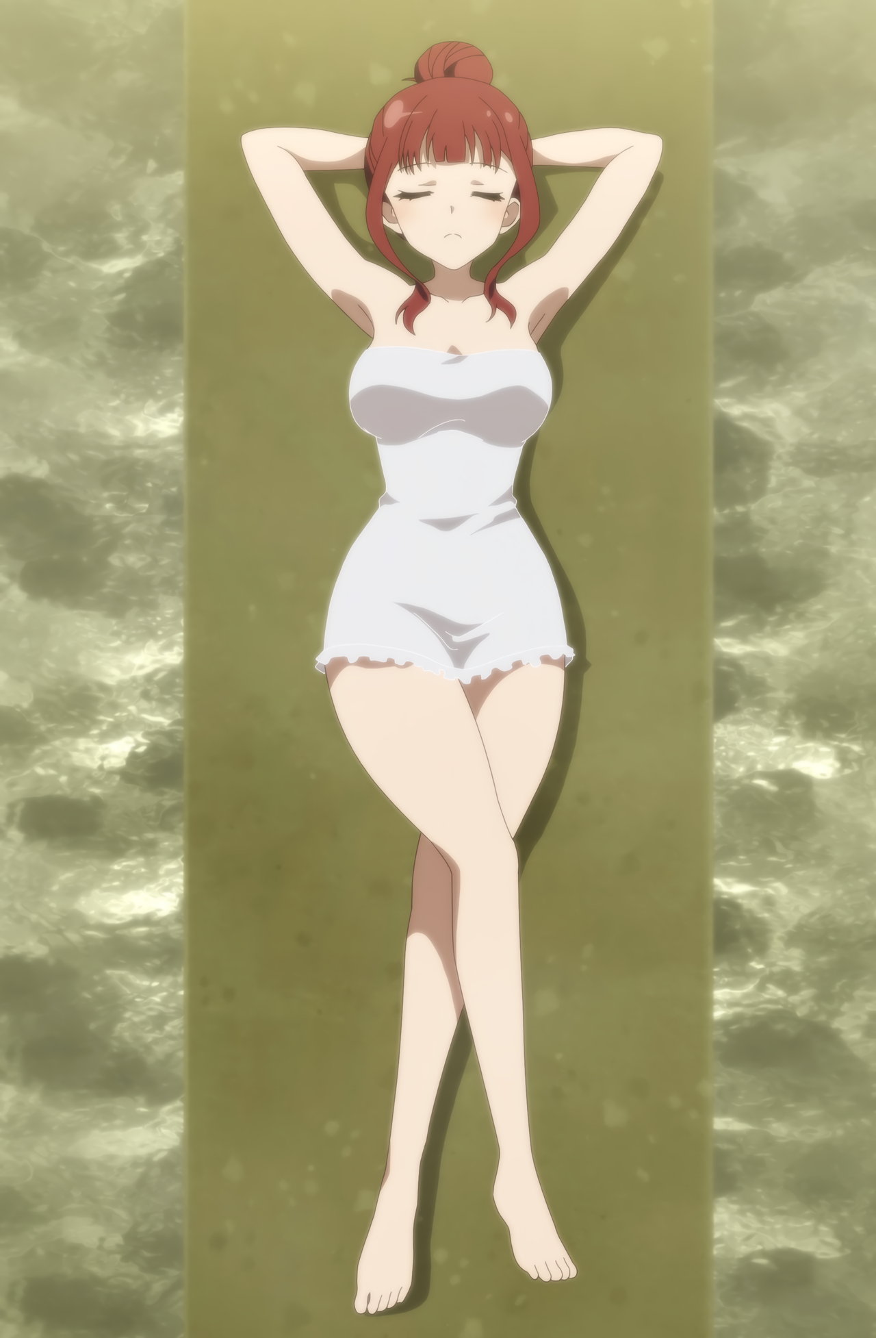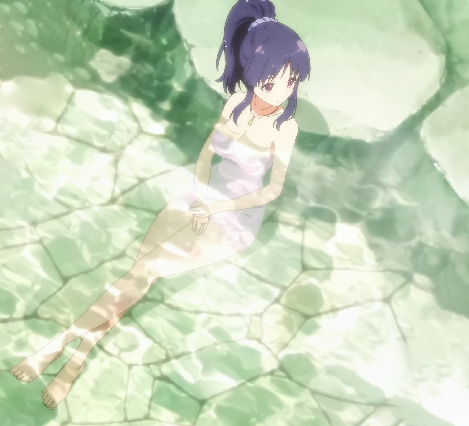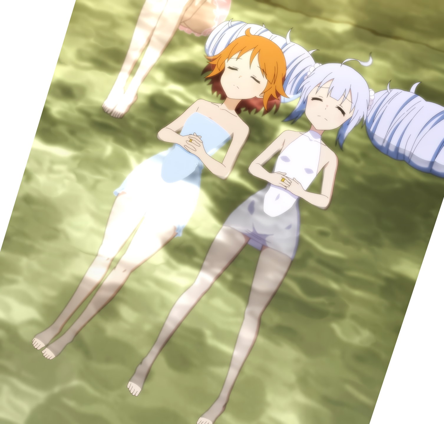 足湯に浸かる梨璃、楓、二水。生脚がエロい。