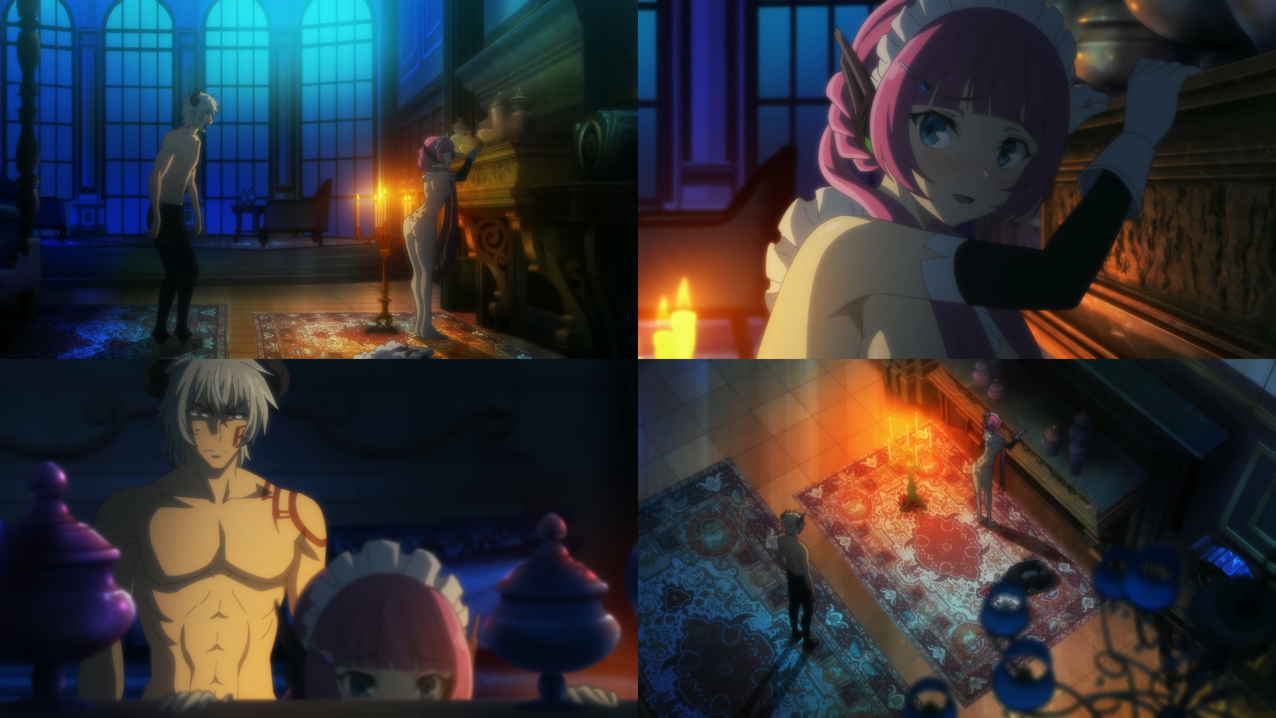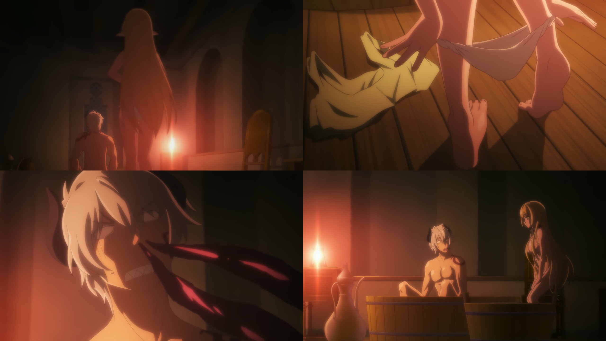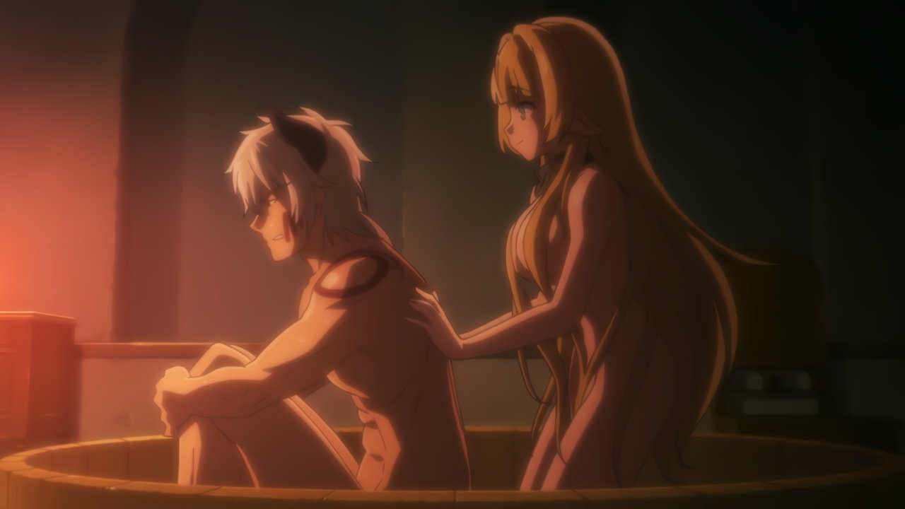盥風呂に入浴中のディアヴロ。そこへシェラが現れ、脱衣・全裸となる。