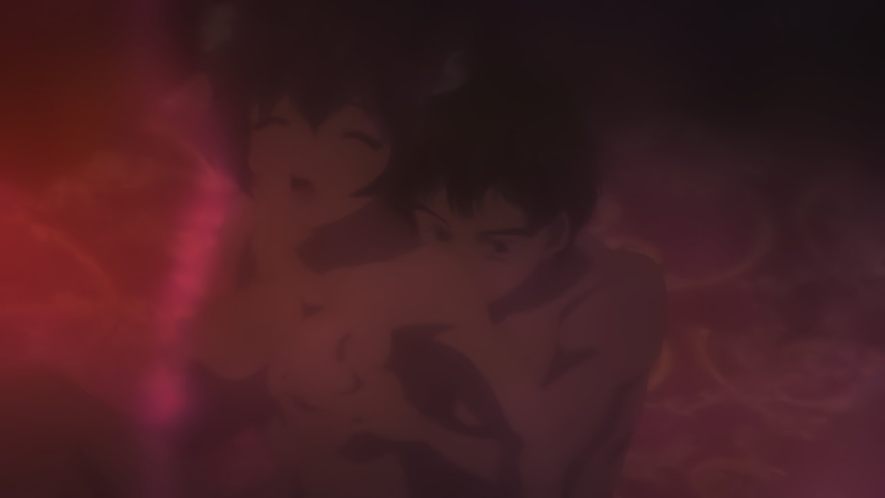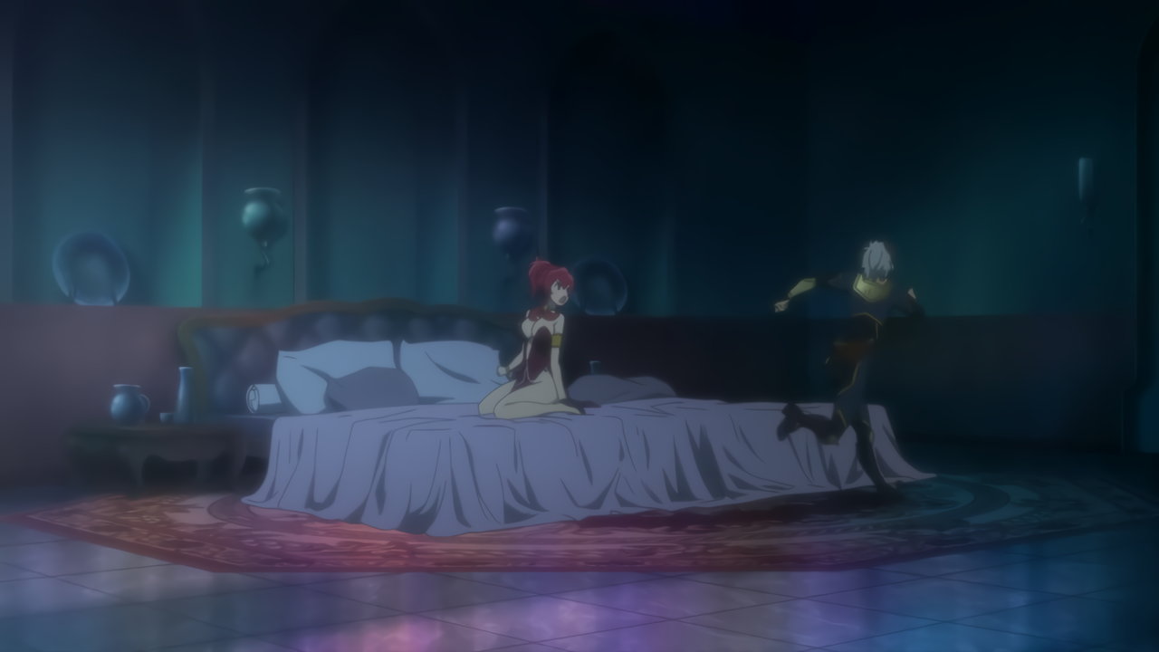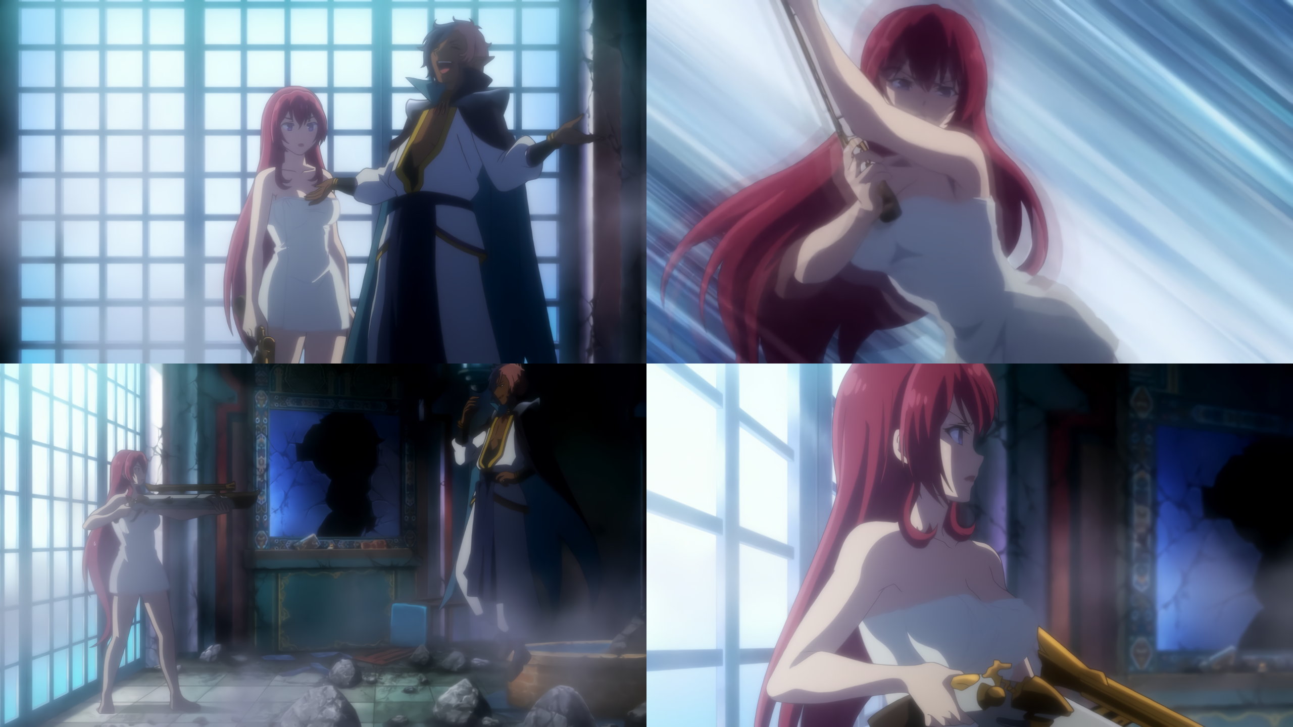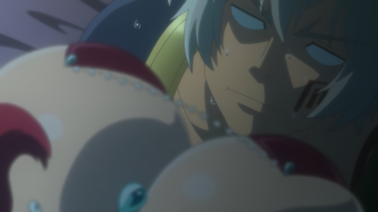 盥風呂に入浴中のディアヴロ。そこへシェラが現れ、脱衣・全裸となる。