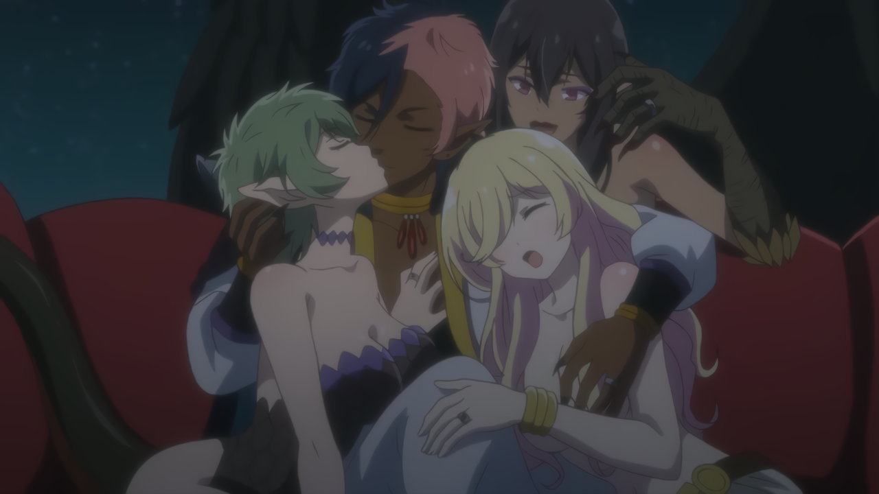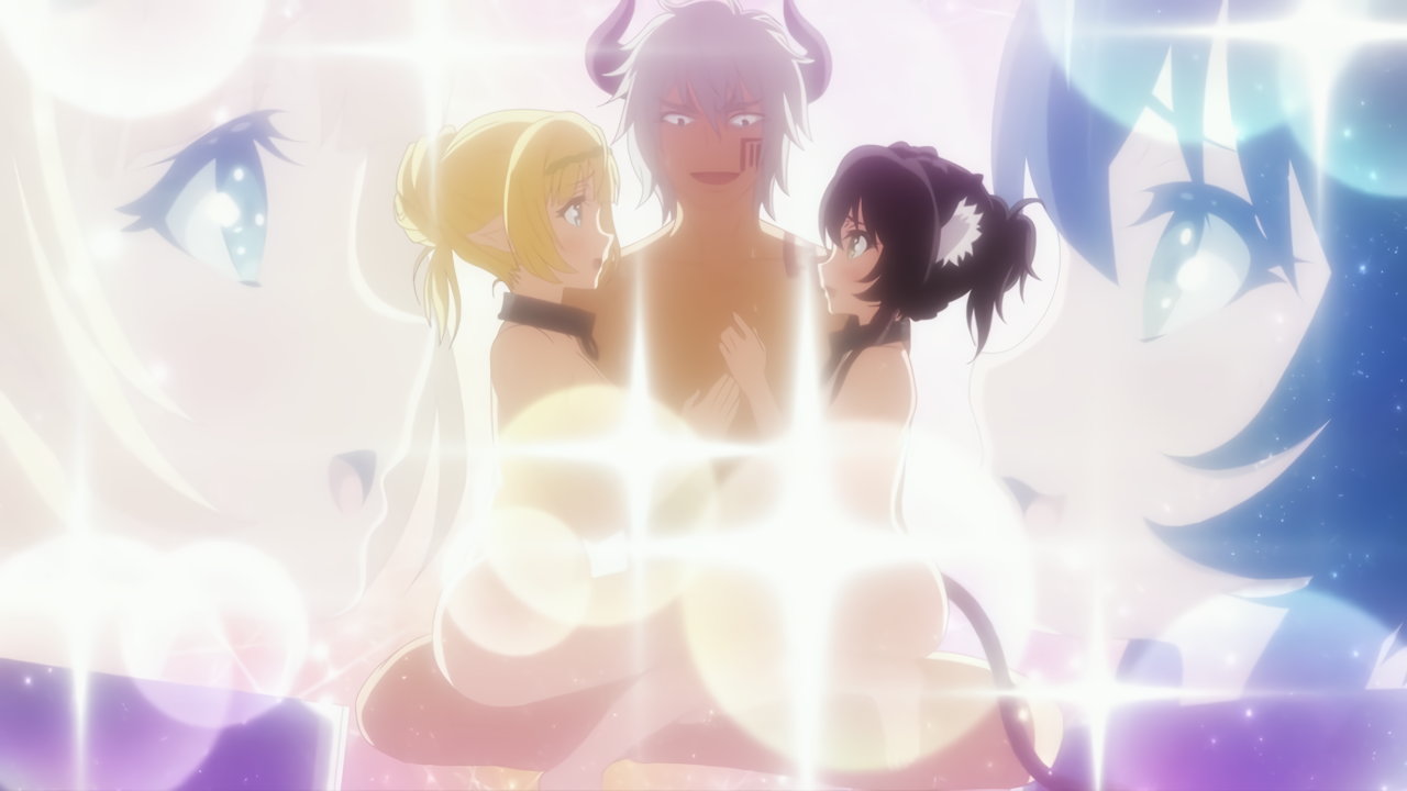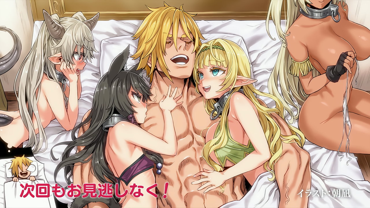 【エンドカード】ベッドで半裸姿のヒロインたちに囲まれるディアヴロ(絵師:朝凪)