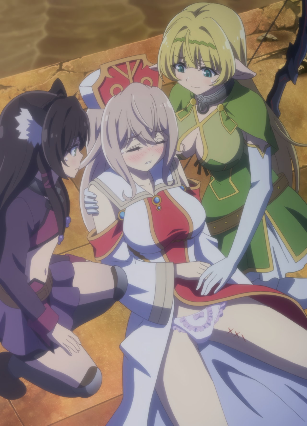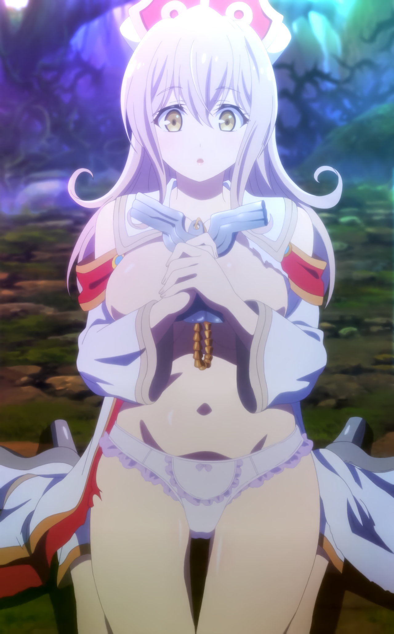 股間全開・パンツ丸見えのルマキーナ。ルマキーナのおっぱいを触るシェラ。