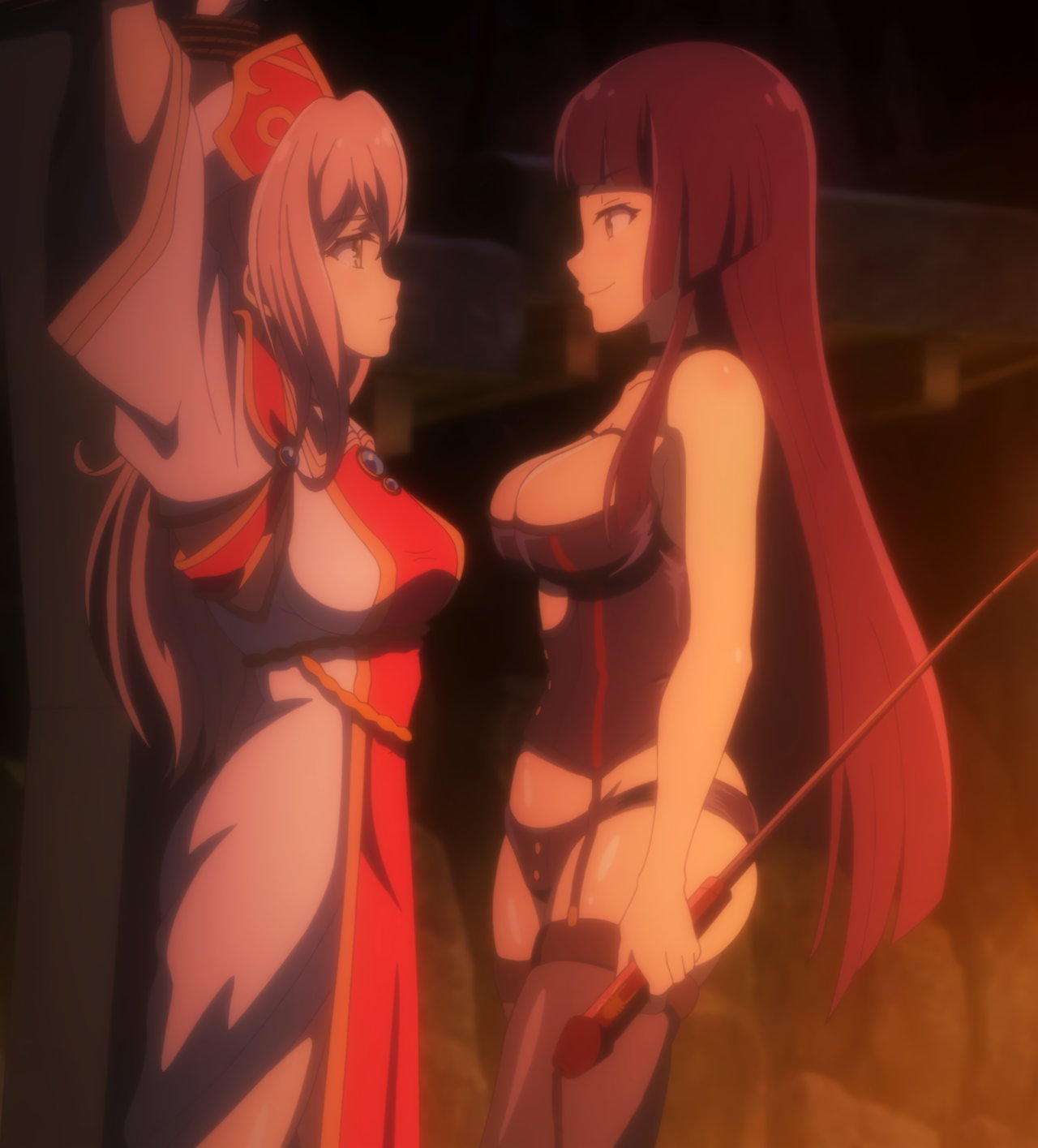 拘束中のルマキーナの前に現れる、ボンデージ衣装のアリシア。