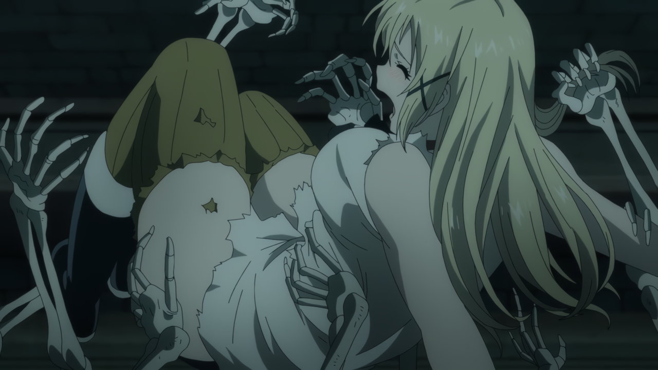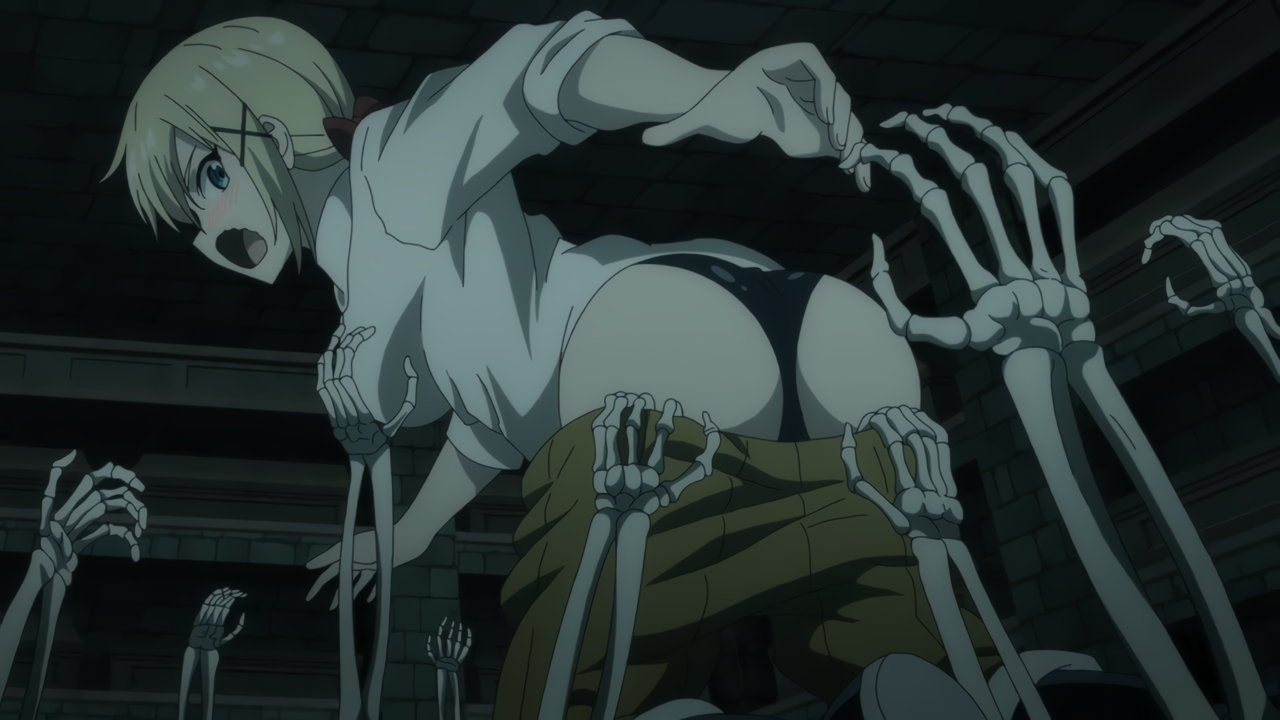 骸骨集団に襲われ、ズボンを剥ぎ取られるユナ。