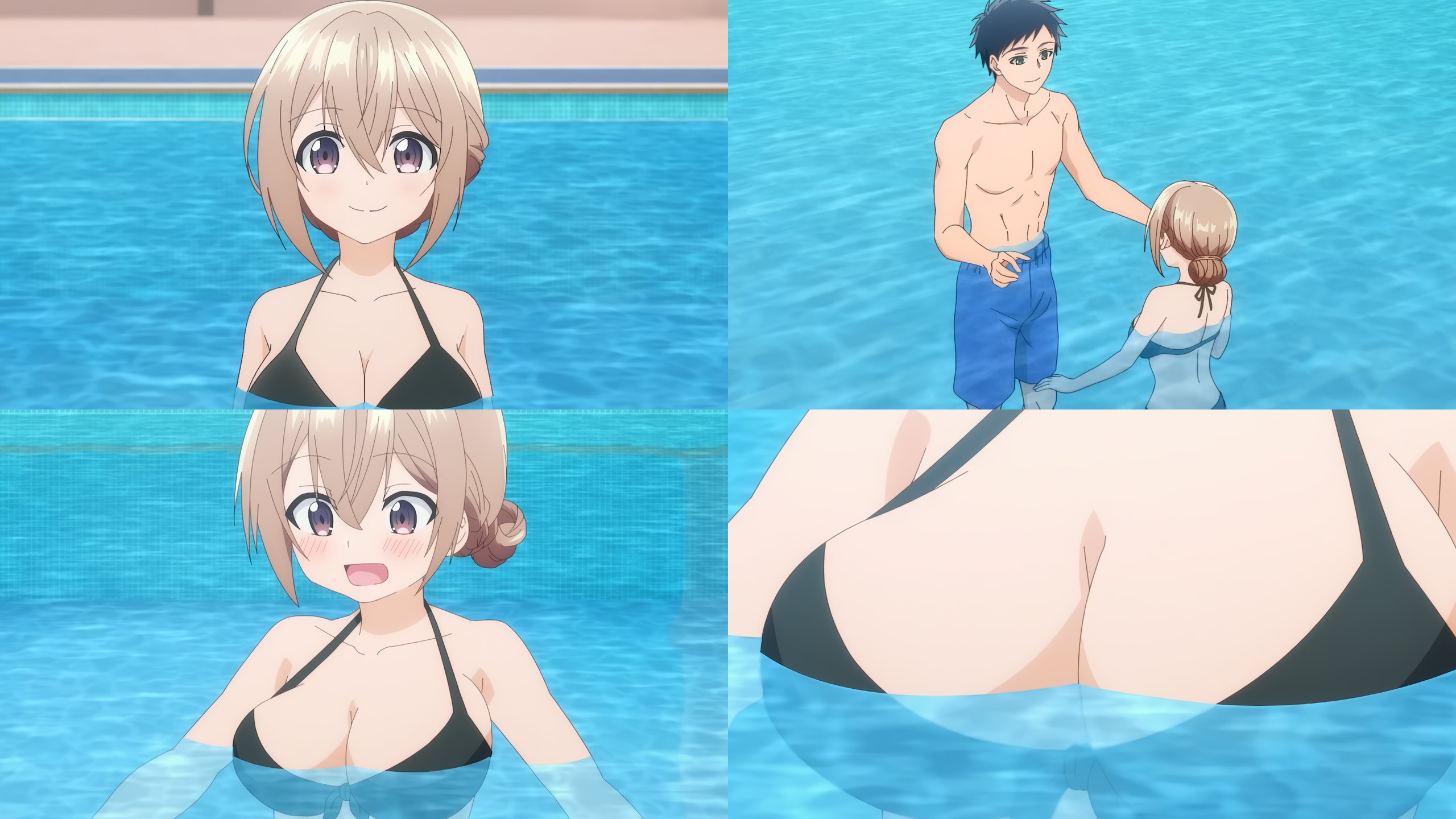 詩織里の水着ブラ紐を結び直す拓馬。