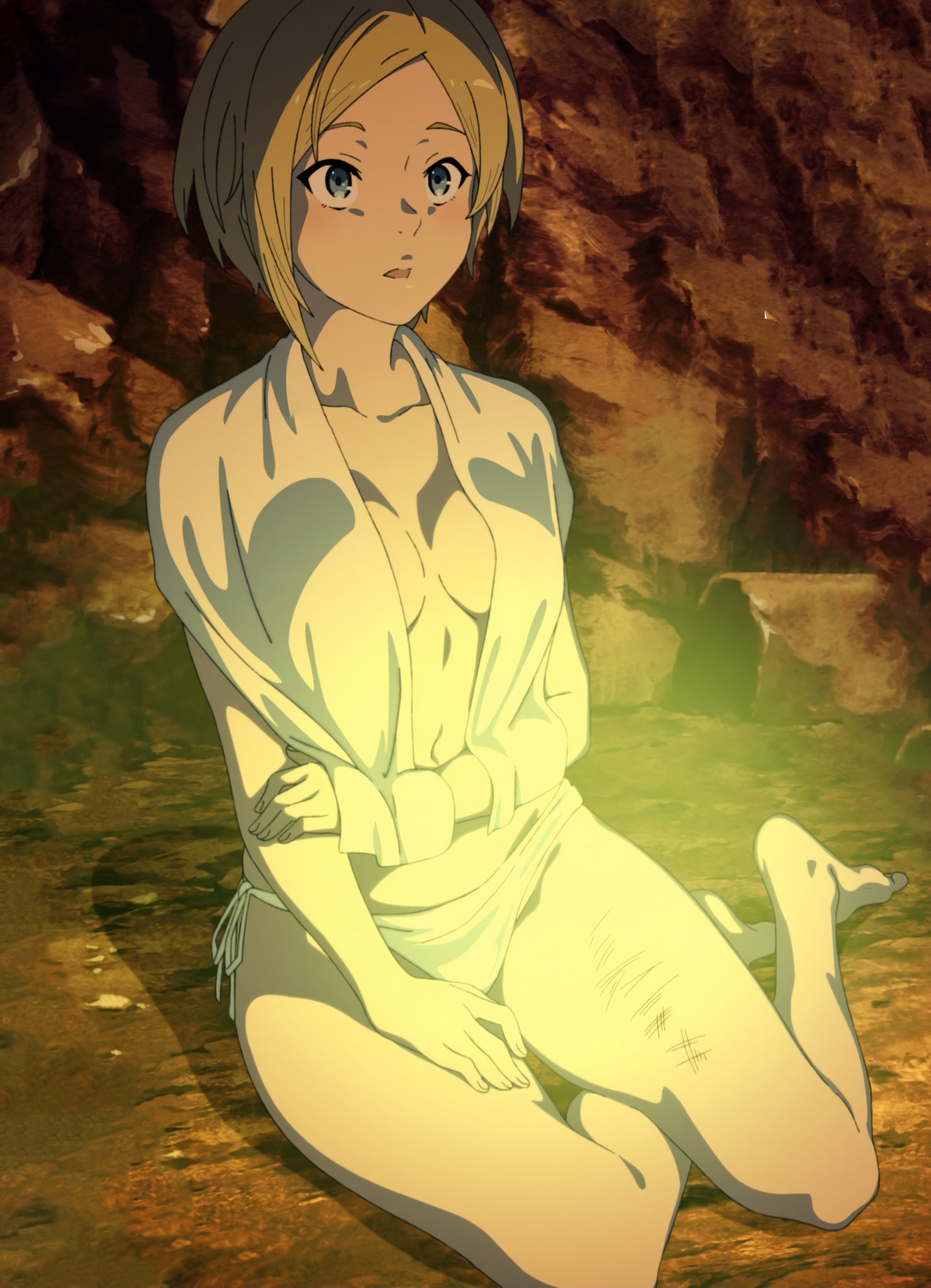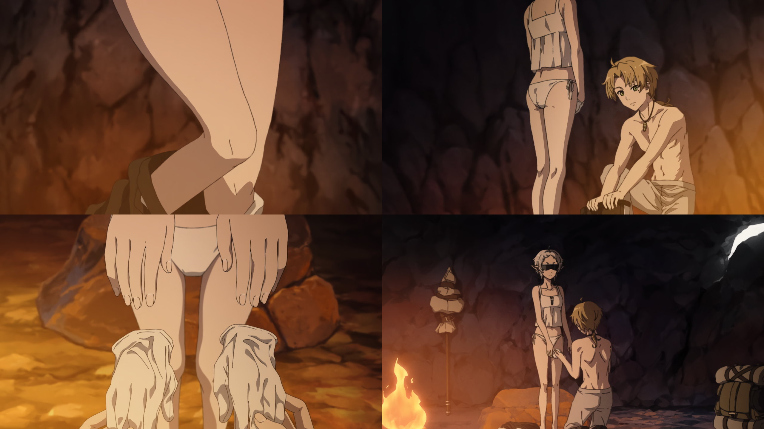 焚火の前でシルフィの服を脱がすルーデウス。